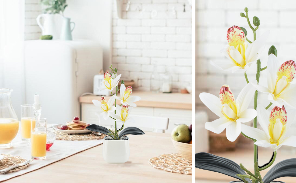 لمسة منزلية أنيقة: تنبع زهرة الأوركيد الصناعية الخاصة بنا من البلاستيك عالي الجودة ذو الملمس الحقيقي، وتقع في مزهرية سيراميك أنيقة مع زهور الأوركيد الاصطناعية، وتعزز ديكور المنزل، مما يجعلها ديكور طاولة مركزية لغرفة المعيشة المتطورة.