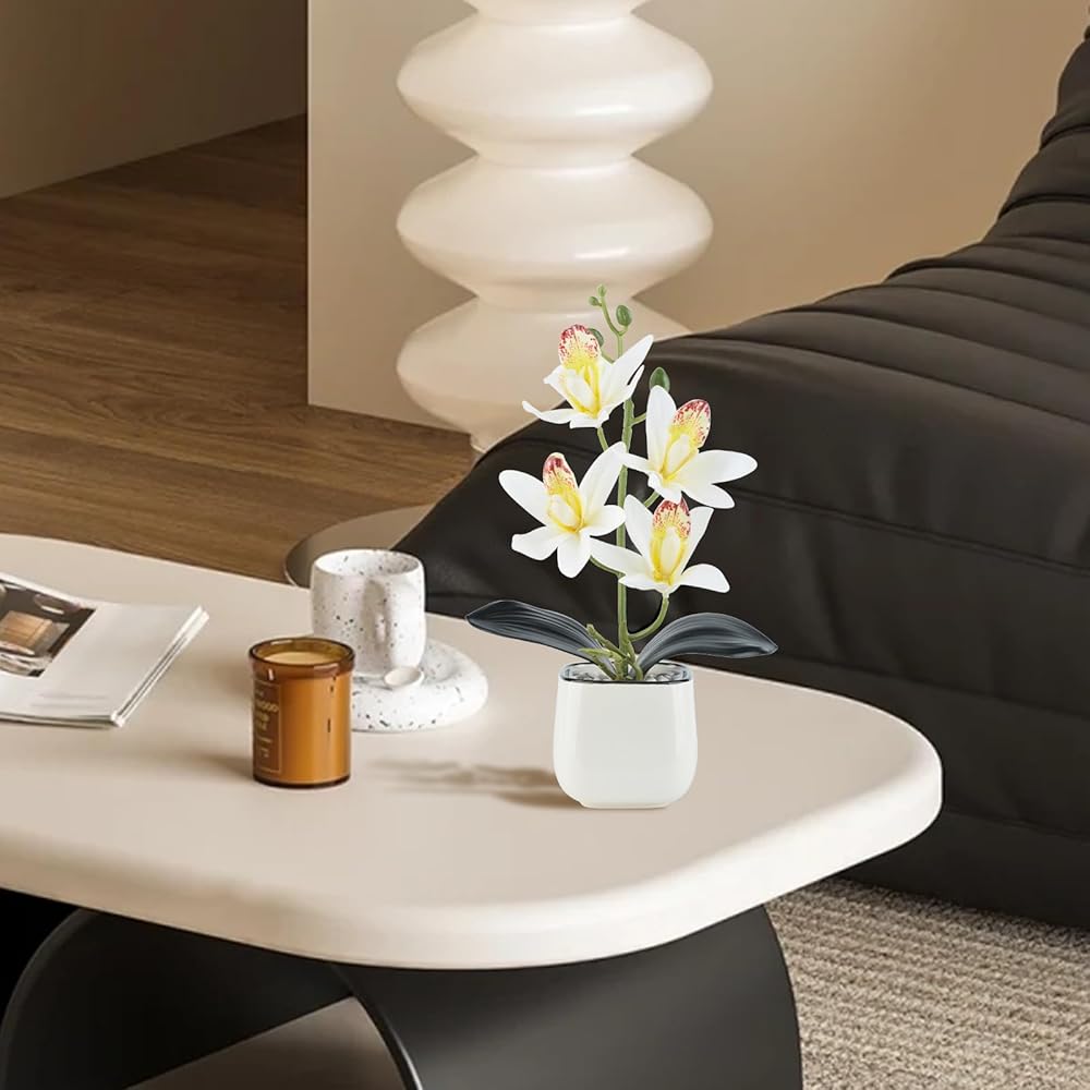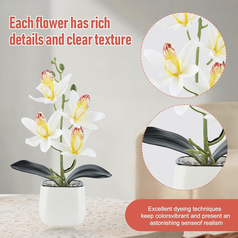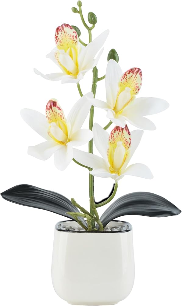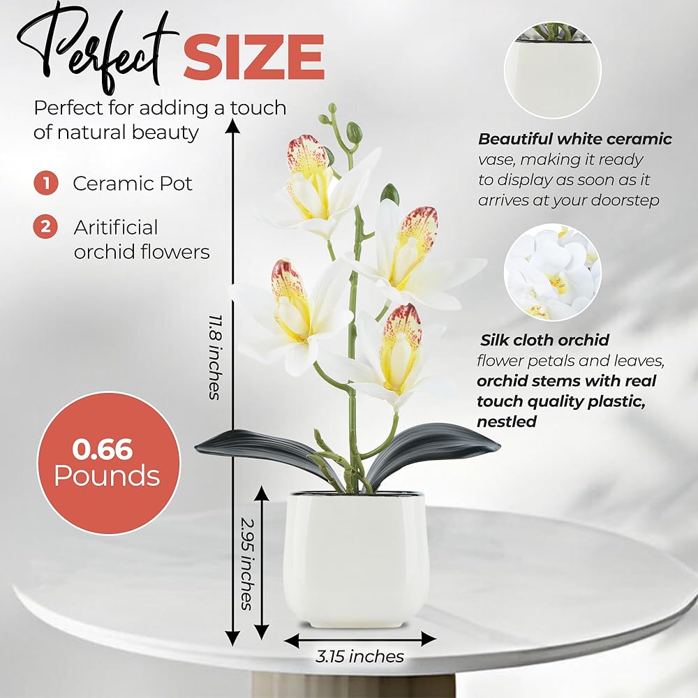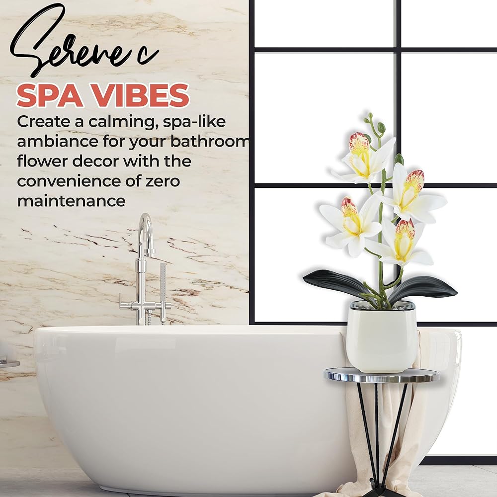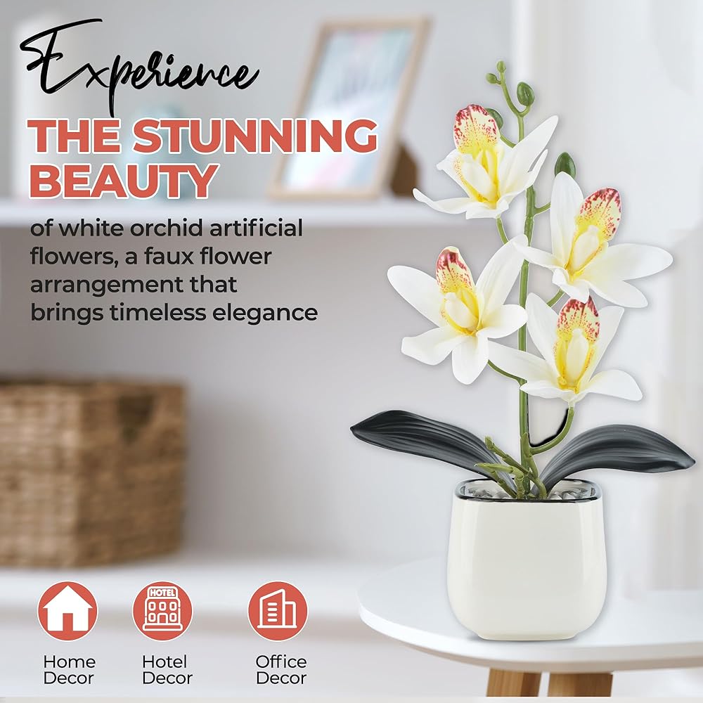 أناقة الأوركيد: استمتع بالجمال المذهل لزهور الأوركيد الصناعية البيضاء، وهو ترتيب زهور صناعية يجلب الأناقة الخالدة إلى مساحتك دون أي صيانة، مثالي لكل من النباتات المكتبية وديكور الحمام الزهري.