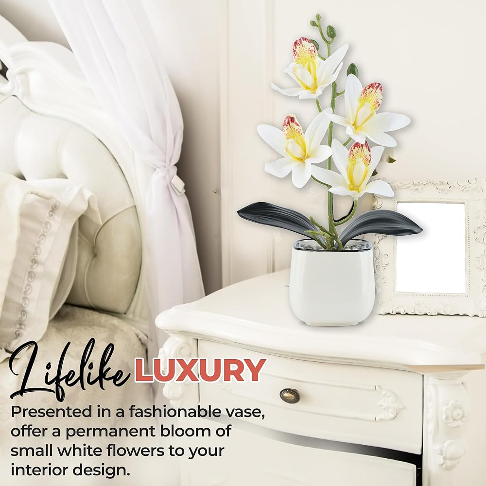 فخامة نابضة بالحياة: استمتع بواقعية زهور الأوركيد الحريرية لدينا ذات السيقان التي تبدو حقيقية؛ توفر نباتات الأوركيد الصناعية هذه لديكور المنزل، والمقدمة في مزهرية عصرية، إزهارًا دائمًا من الزهور البيضاء الصغيرة لتصميمك الداخلي.