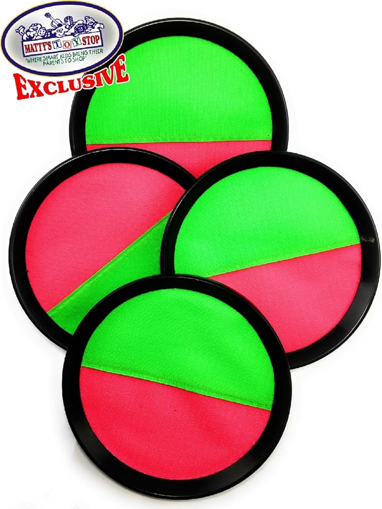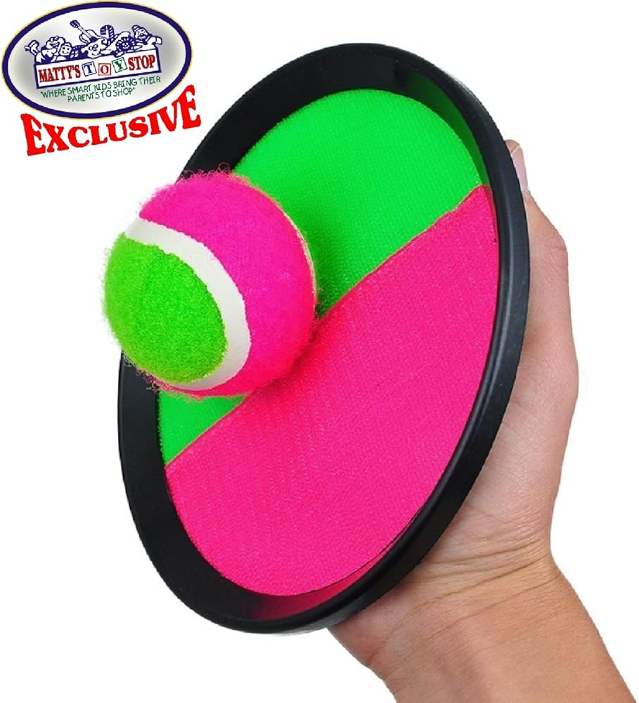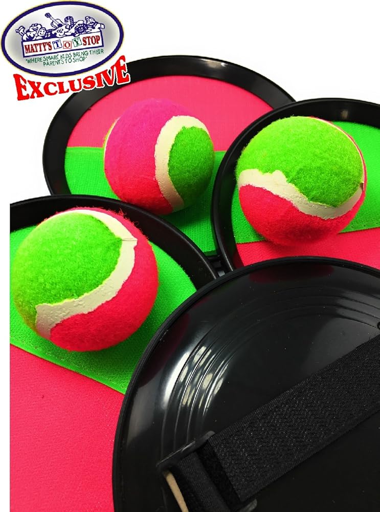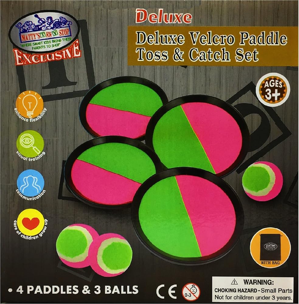 Matty's Toy Stop Deluxe Toss & Catch (Hook & Loop) Paddle Game Set with 4 Paddles, 3 Balls & Storage Bag, is AWESOME! Get ready for endless hours of outdoor excitement with Matty's Toy Stop Deluxe Toss & Catch Paddle Game Set. Whether you're at the park, in the backyard, or enjoying a day at the beach, this set guarantees non-stop fun in the sun. Designed for up to 4 players, this deluxe set includes 4 paddles, 3 balls, and a convenient storage bag. With the extra balls provided, the excitement never fades. Each paddle features a self-stick front surface and an adjustable strap on the back, ensuring a secure grip and comfortable fit for players of all ages. The hook and loop design adds an extra layer of enjoyment to the classic game of catch. Playing is a breeze! Simply stand a distance apart, toss the self-stick ball, and skillfully catch it on your paddle. The Toss and Catch game not only guarantees laughter and enjoyment, but also provides an excellent opportunity to develop hand-eye coordination and improve motor skills. It's a game that challenges and engages players of all ages, making it perfect for family gatherings, picnics, parties, or spontaneous outdoor play with friends. The vibrant colors of the paddles and ball enhance visibility, ensuring that the game stays lively and engaging. Whether under the bright sun or in the shade, the bold colors make it easy to keep track of the action. Matty's Toy Stop is committed to providing high-quality toys that withstand the test of time, and the Deluxe Toss & Catch Paddle Game Set is no exception. Crafted with durability in mind, this set is built to withstand countless hours of active play and enjoyment. Experience the joy of outdoor play with Matty's Toy Stop Deluxe Toss & Catch Paddle Game Set. Order now and create lasting memories filled with laughter and friendly competition. It's time to embrace the fun and excitement of this classic game, tailored for the whole family. Get ready to unleash your skills, challenge your friends, and enjoy hours of active entertainment wherever you go!