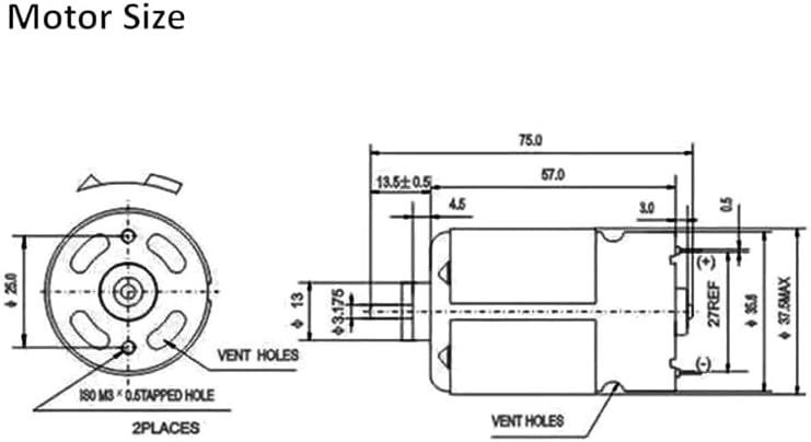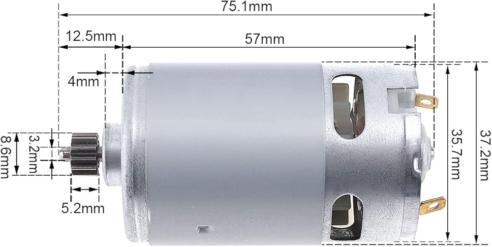 Motor length: 75.1mm; Motor diameter: 37.2mm; Motor shaft length: 12mm; Motor shaft diameter: 3.2mm; Motor gear diameter: 8.6mm; Motor gear thickness: 5.2mm; Motor installation hole distance: 25mm