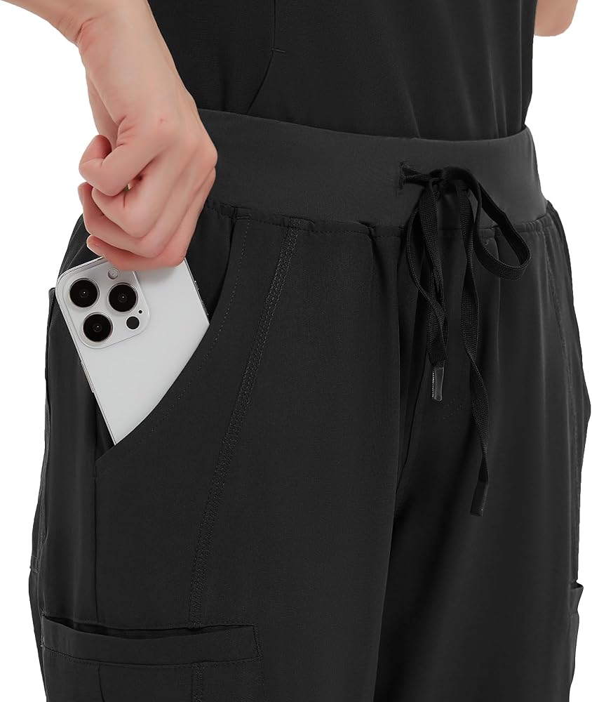 FUNCTION POCKETS—Stay organized with these scrub pants that offer a total of six pockets. You'll find 2 deep trouser pockets,2 sides cargo pockets ,and 2 back patch pockets, Keep all your essentials close at hand, from swabs and syringes to pens and smartphones. Experience practical comfort whether you're on the job or unwinding.