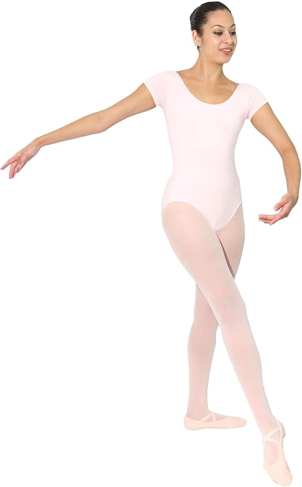 Leotard features short capped sleeves appropriate as a basic leotard for ballet or paired with pants, skirts, or under dresses. Cotton/spandex fabric is breathable and stretchable.