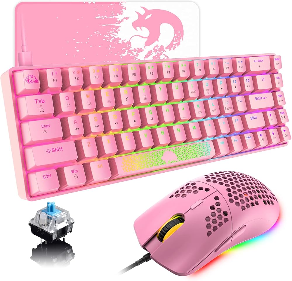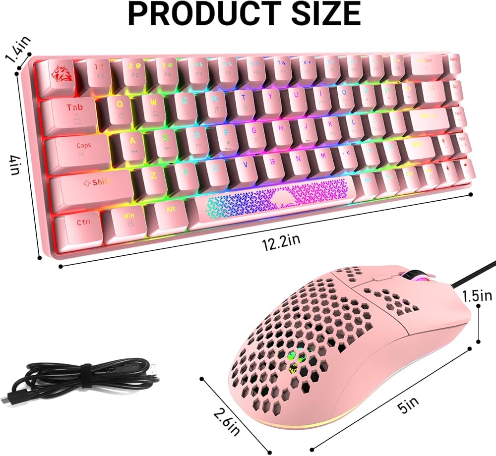 مجموعة لوحة مفاتيح وماوس ميكانيكية للألعاب بنسبة 60%، إضاءة خلفية RGB مريحة ومضادة للظلال، 68 مفتاحًا، 6400 ديسيبل متوحد الخواص، الفئران الصامتة على شكل قرص العسل من النوع C سلكية لأجهزة الكمبيوتر Mac Gamer