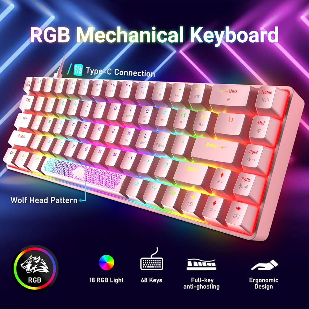 【لوحة مفاتيح ميكانيكية احترافية】لوحة المفاتيح الميكانيكية هذه صغيرة ومحمولة مع 68 مفتاحًا ورفيعة للغاية وخفيفة الوزن وتصميم خارجي رائع. لوحة مفاتيح الألعاب سهلة الحمل وتوفر مساحة أكبر لفأرة الألعاب وسطح المكتب. مفتاح كامل مضاد للظلال، اتصال سلكي من النوع C، تصميم مريح، إنه أكثر سهولة لكل من المكتب والألعاب.