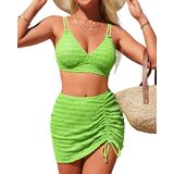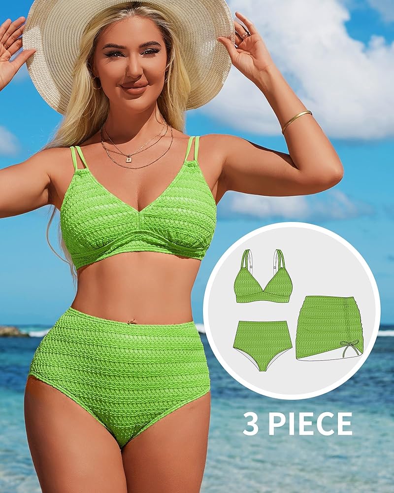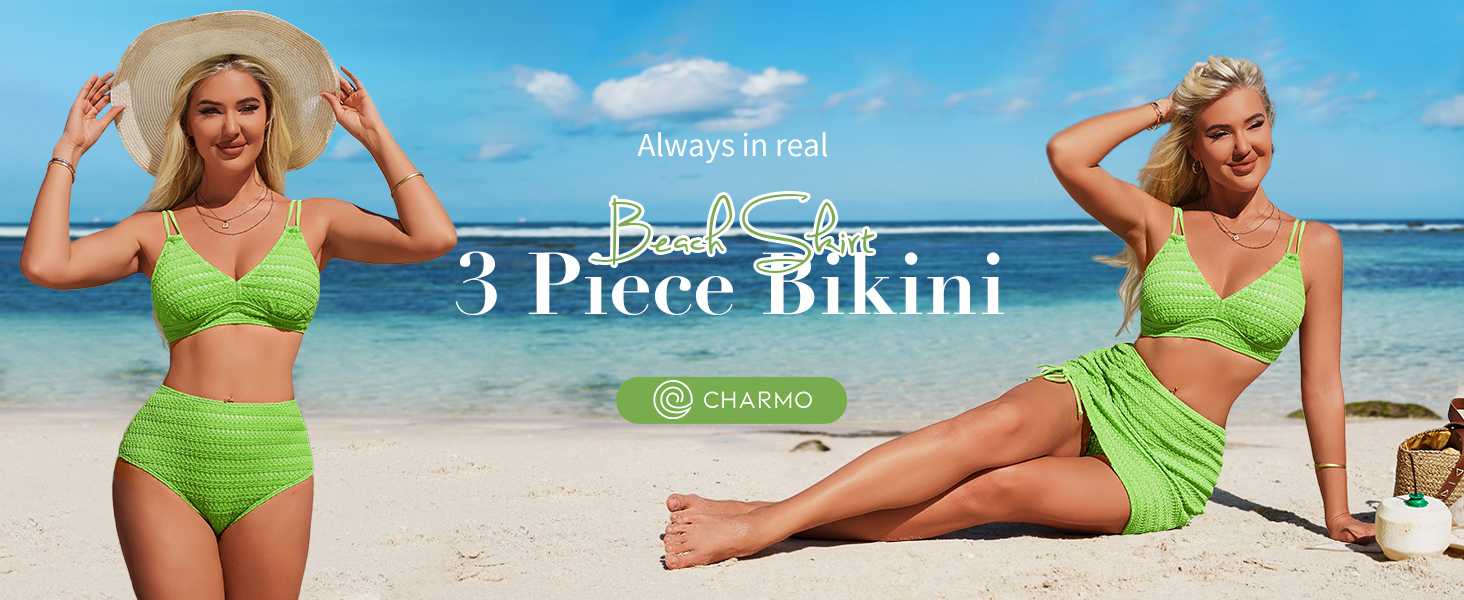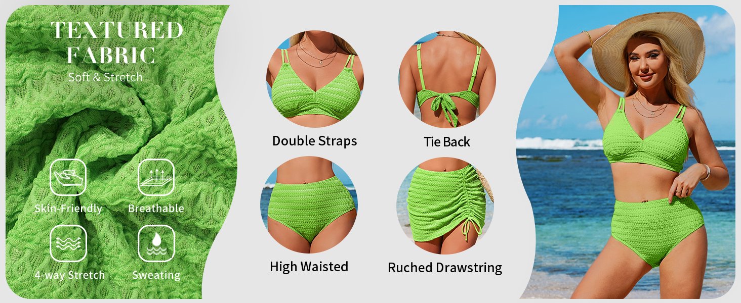 المزايا: طقم بيكيني من 3 قطع، رقبة مثلثة على شكل حرف V، أشرطة مزدوجة قابلة للتعديل، أكواب قابلة للإزالة، جزء علوي بيكيني برباط خلفي، جزء سفلي بيكيني عالي الخصر، تنورة مكشكشة برباط للتغطية
