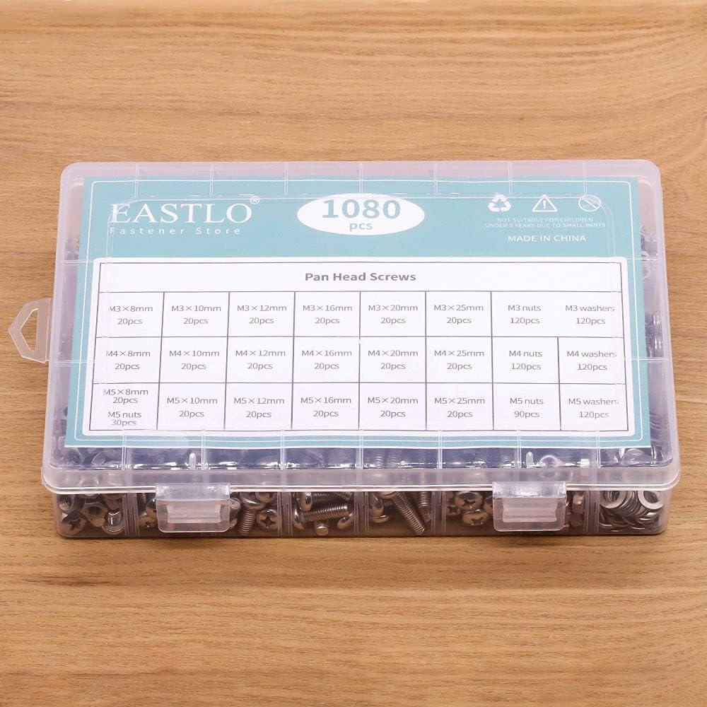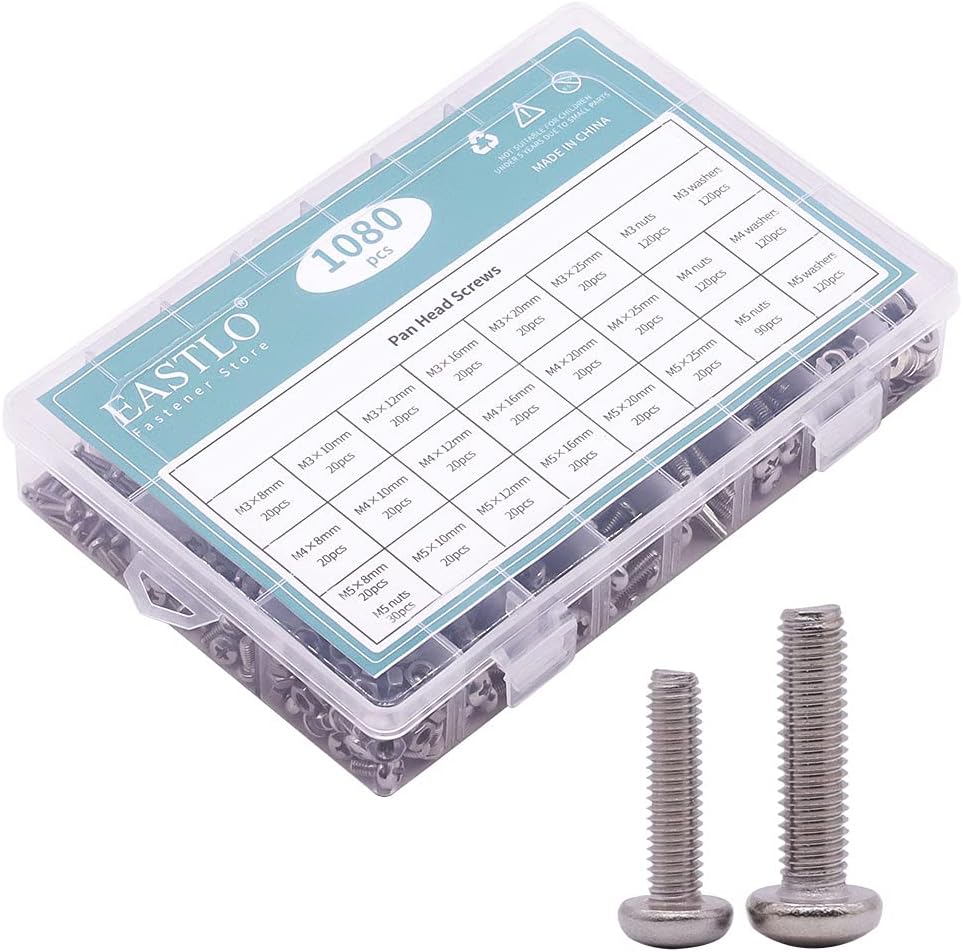 EASTLO 1080 PCS M3 M4 M5 Pan Head Machine Screws Hardware Kits Phillips Drive Assortments Stainless Steel 304 (18-8) Full Thread