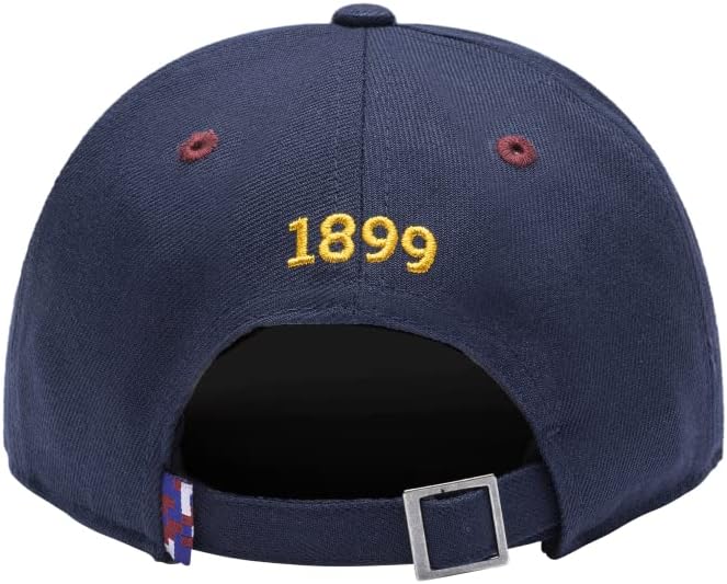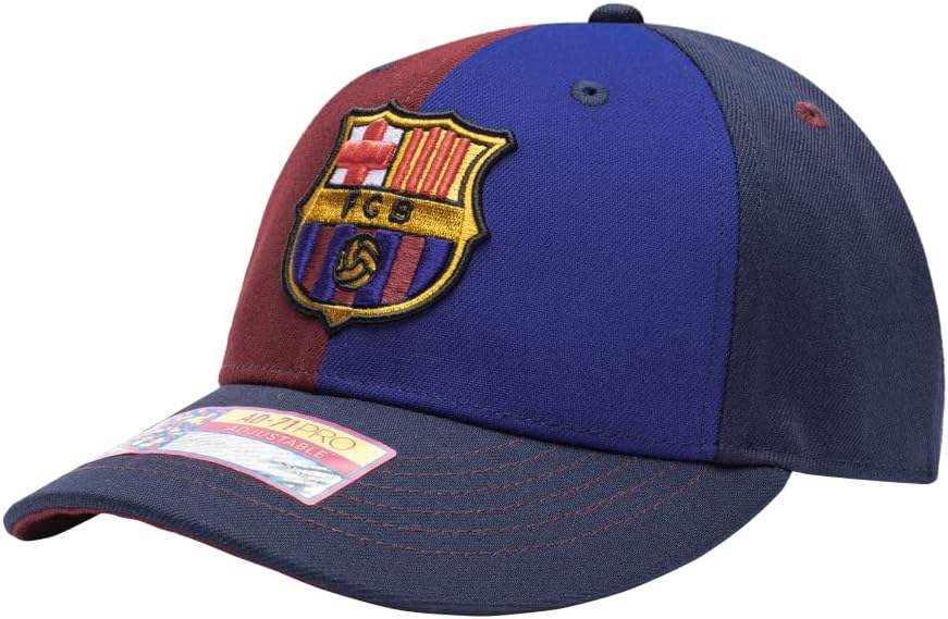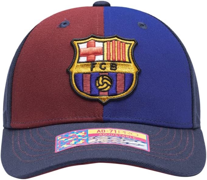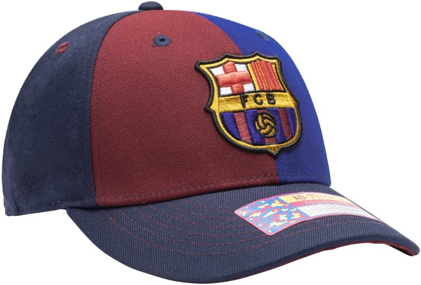 This Barcelona 'Marina' soccer hat from Fan Ink has the following features: An adjustable slider buckle. 6-Panel Mid Crown Curved Peak. Contrast Eyelets, Panels, Stitching & Underpeak. Front 3D Embroidered Logo. Back Embroidery and Digi Loop Label. It is made from 100% Premium Polyester and One Size Fits Most. Show your passion for your favorite team today!