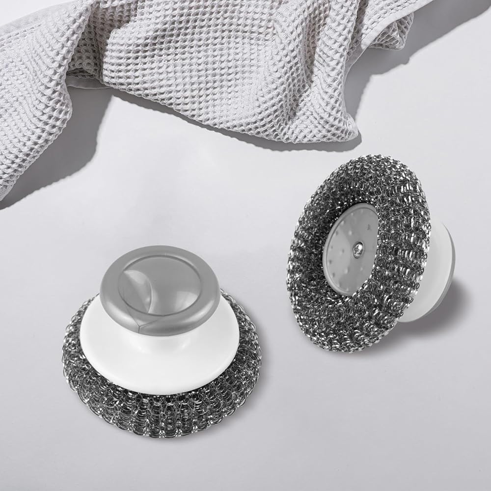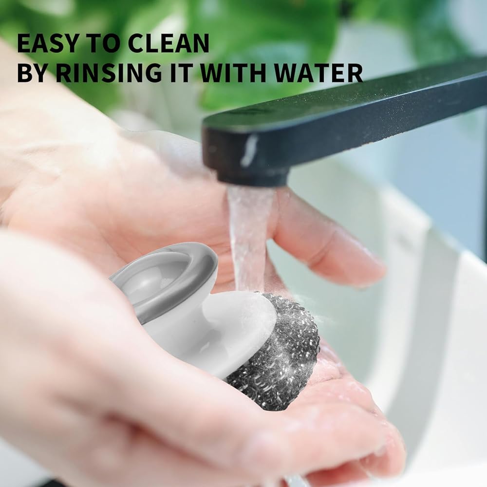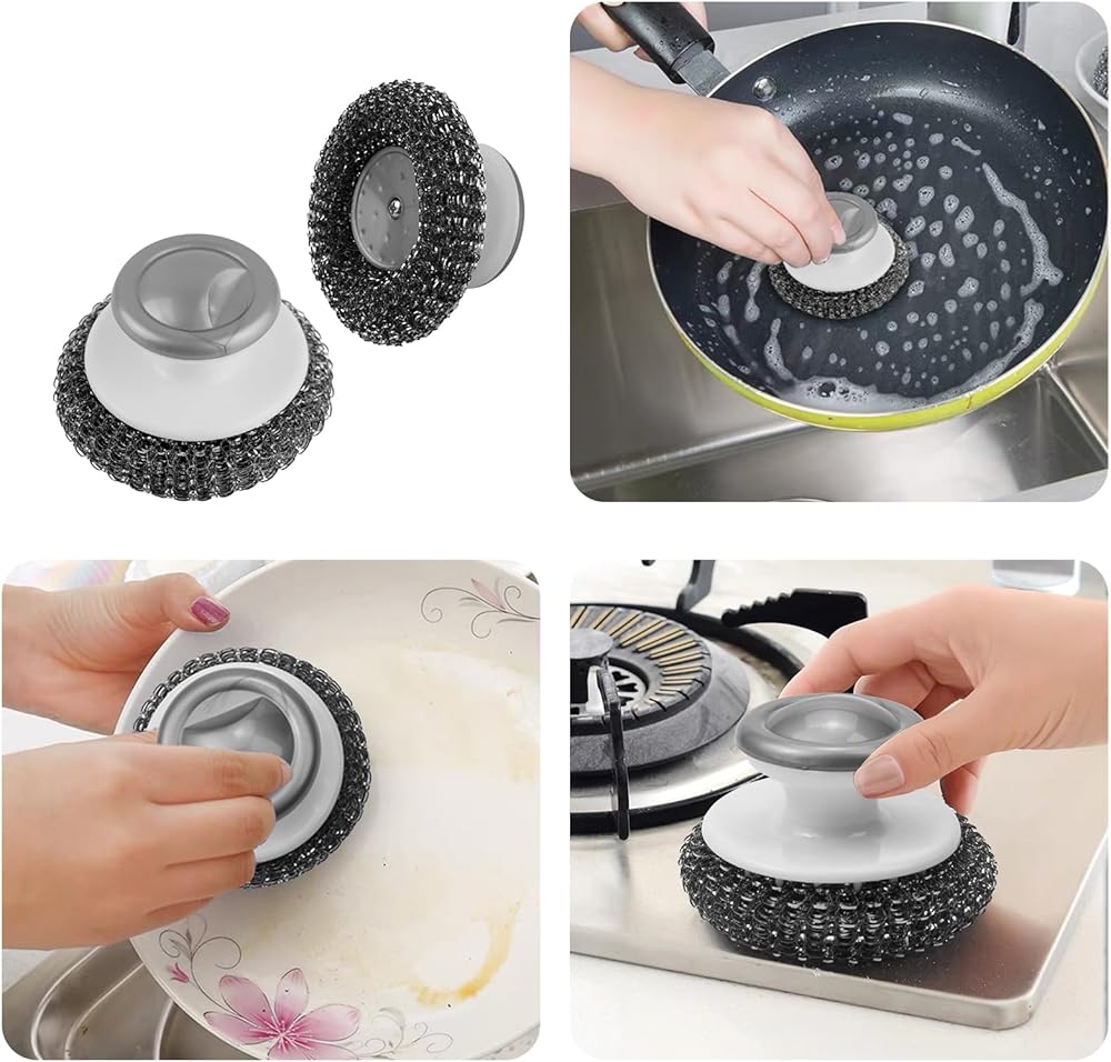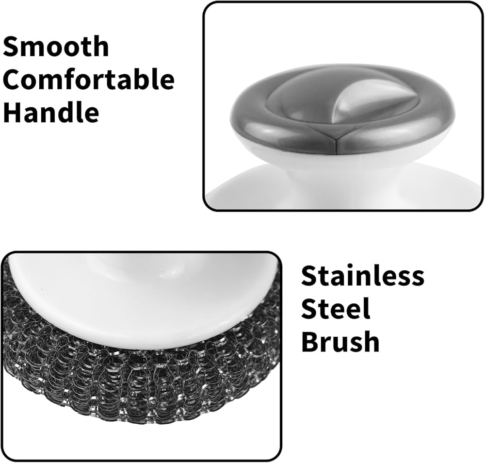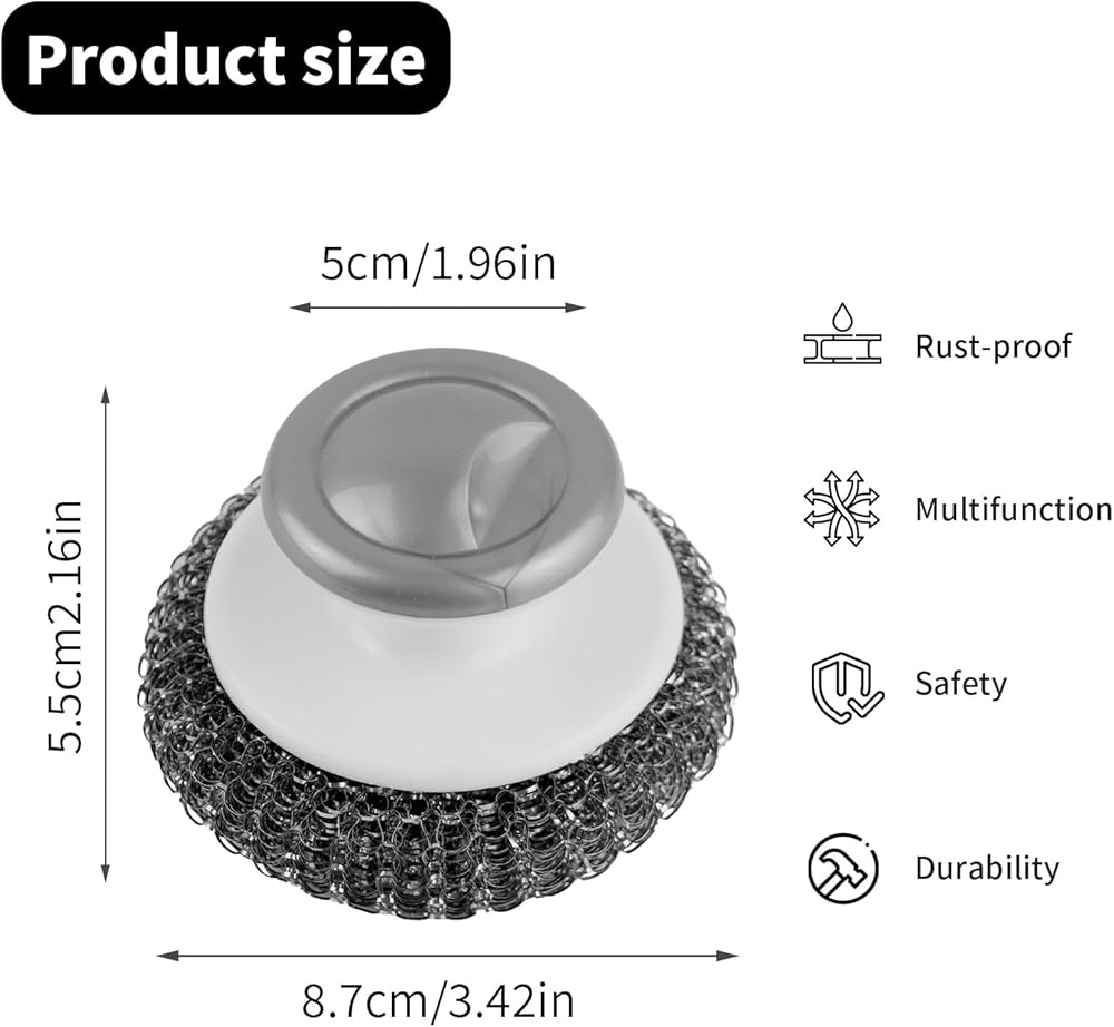 • 【Well-Designed】The handle of the pot scrubbers is ergonomically designed with a convex top, which is easy to grip, comfortable, and convenient to hold. Steel wool scrubber with handle keeps your hands free from stains and cleaning fluids, keeping your palms from immersing in dirty water.