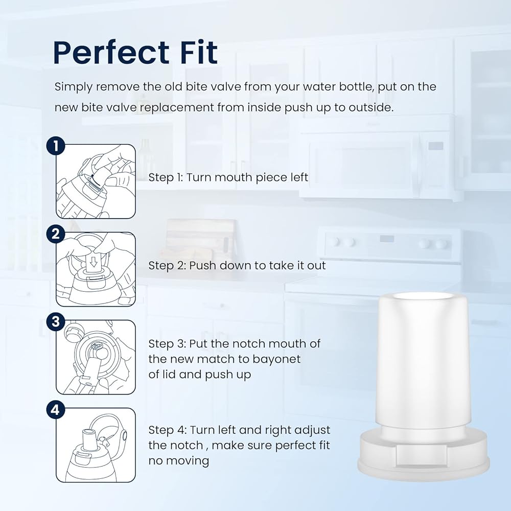 • يمكنك تركيب صمام العض دون أي جهد. ما عليك سوى إزالة صمام العض القديم من زجاجة المياه الخاصة بك، ثم وضع بديل صمام العض الجديد من الداخل إلى الخارج.