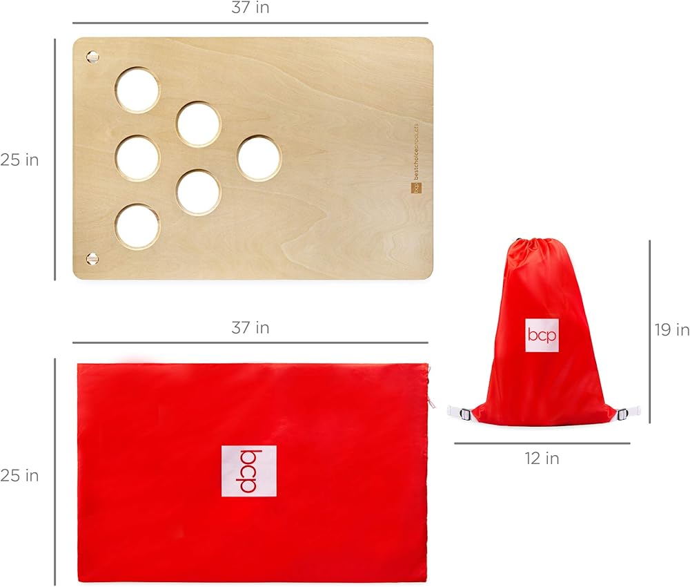 جميع الملحقات متضمنة: كاملة مع لوحتي ألعاب، وستة أكياس فول بلونين، وأغطية 12 فتحة لإنشاء قطعة ترفيهية خارجية الكل في واحد؛ أبعاد لوحة اللعبة: 37 بوصة (طول) × 25 بوصة (عرض)