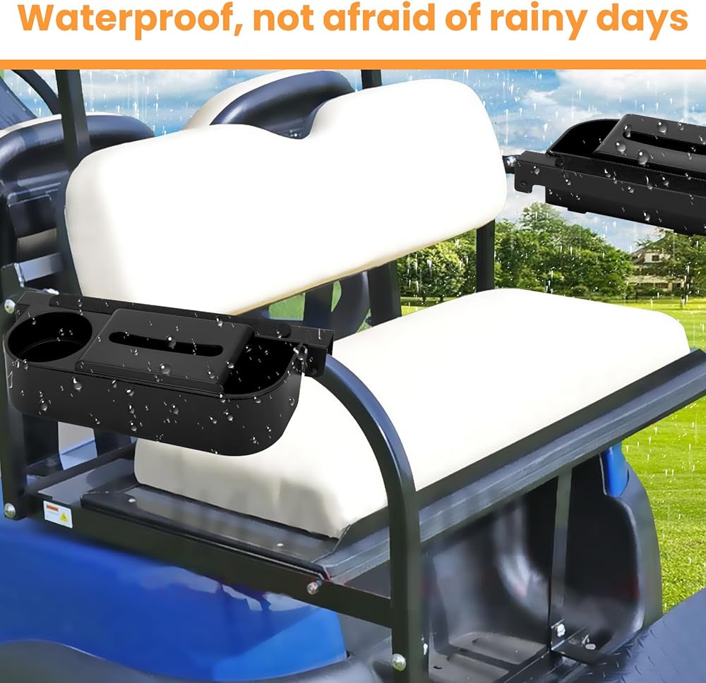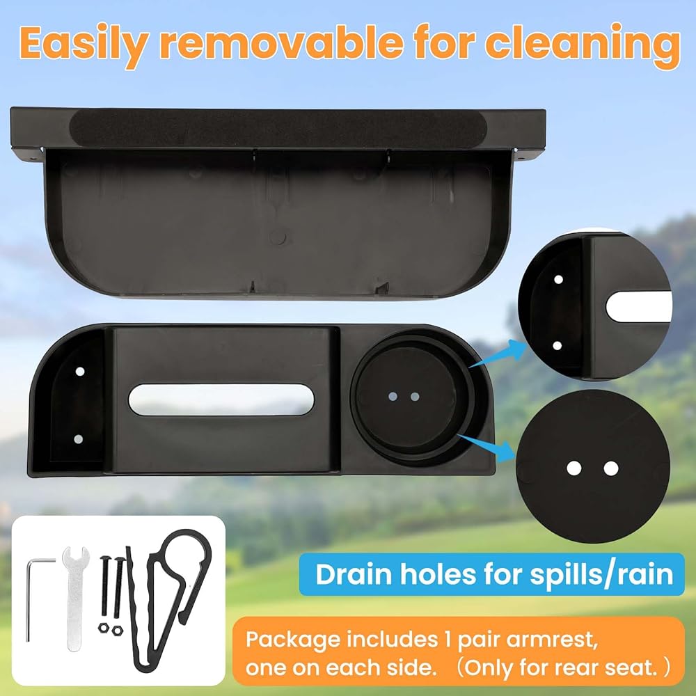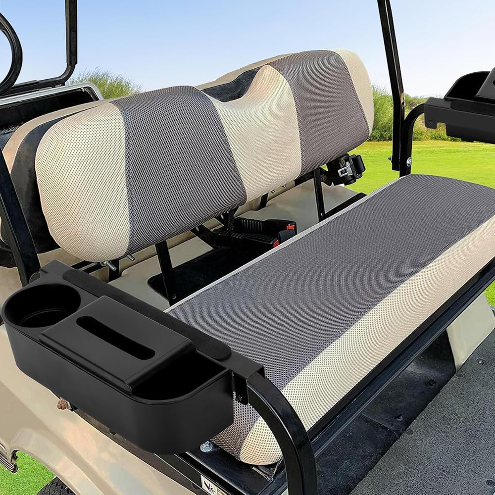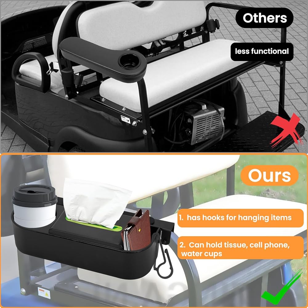 2. 【تصميم جديد مطور】 تم تصميم كل مسند ذراع لعربة الجولف مع حامل أكواب، ووضع حامل المناشف الورقية وحامل الهاتف الخلوي، بالإضافة إلى وجود خطاف، وأكثر وظيفية واكتمالًا.