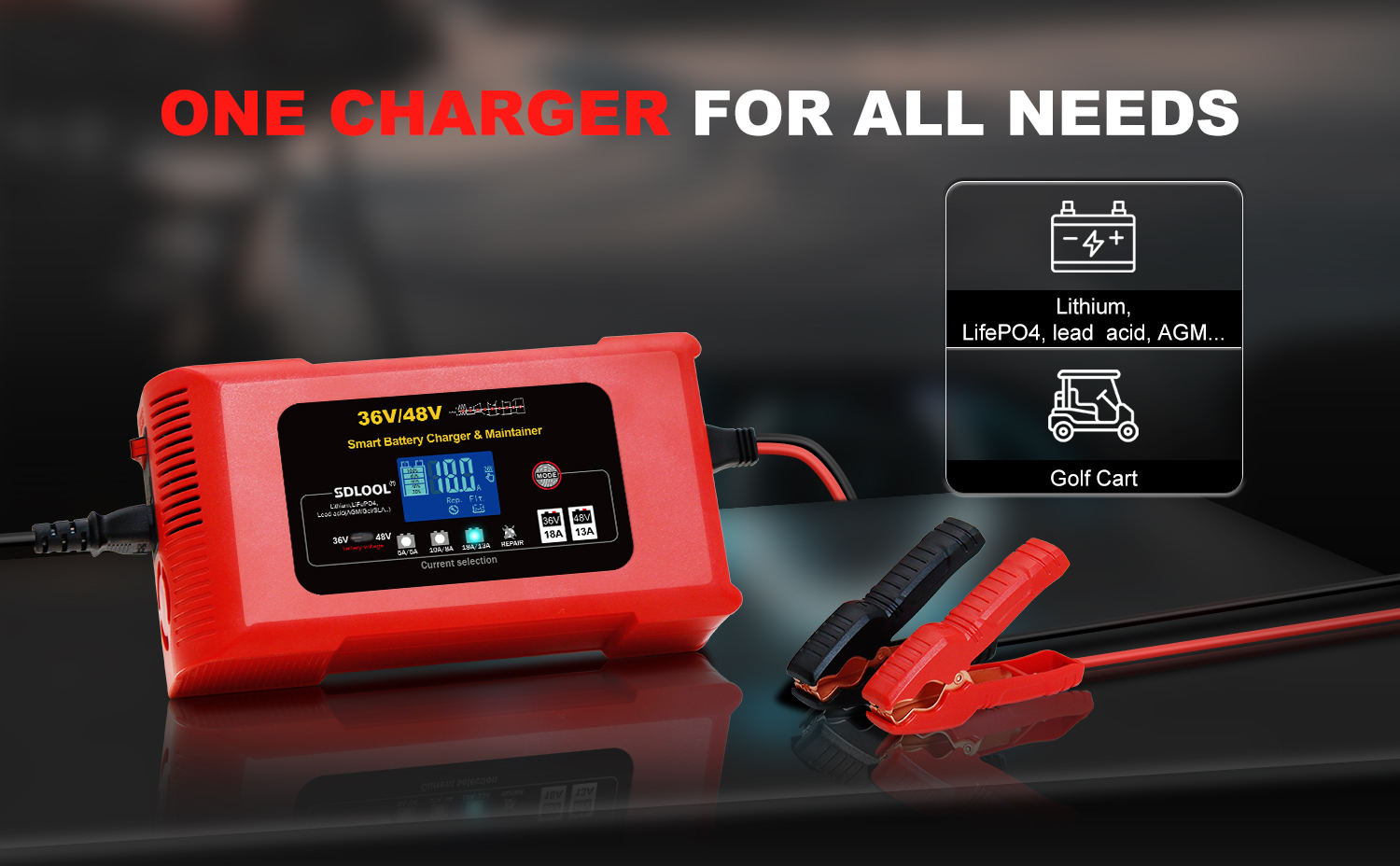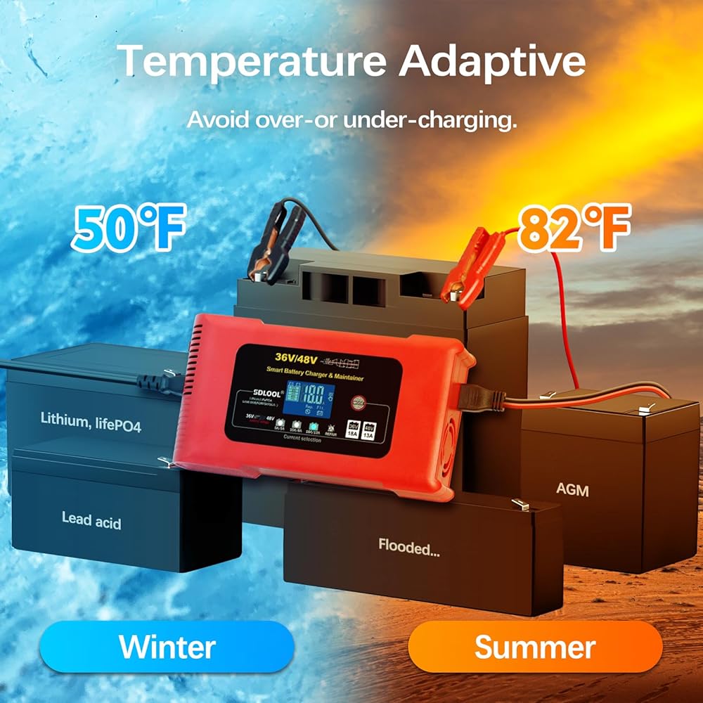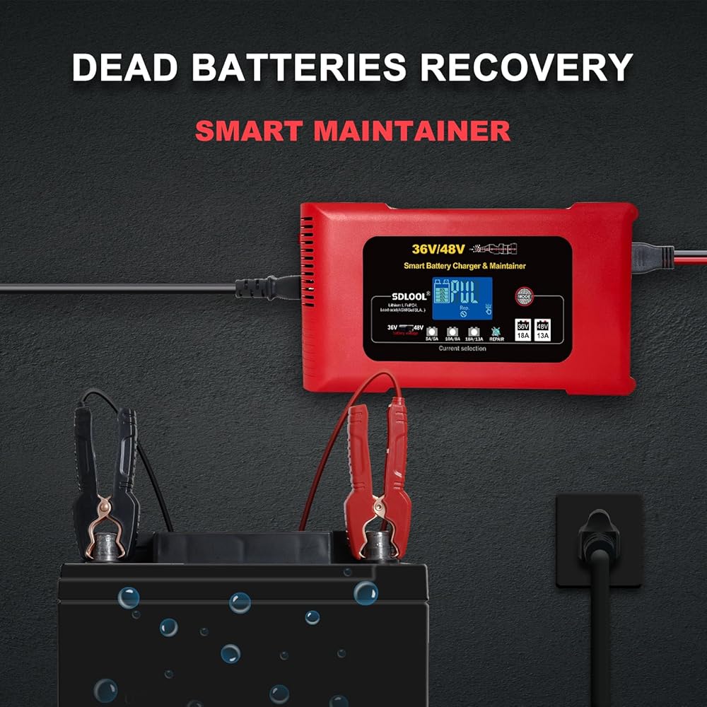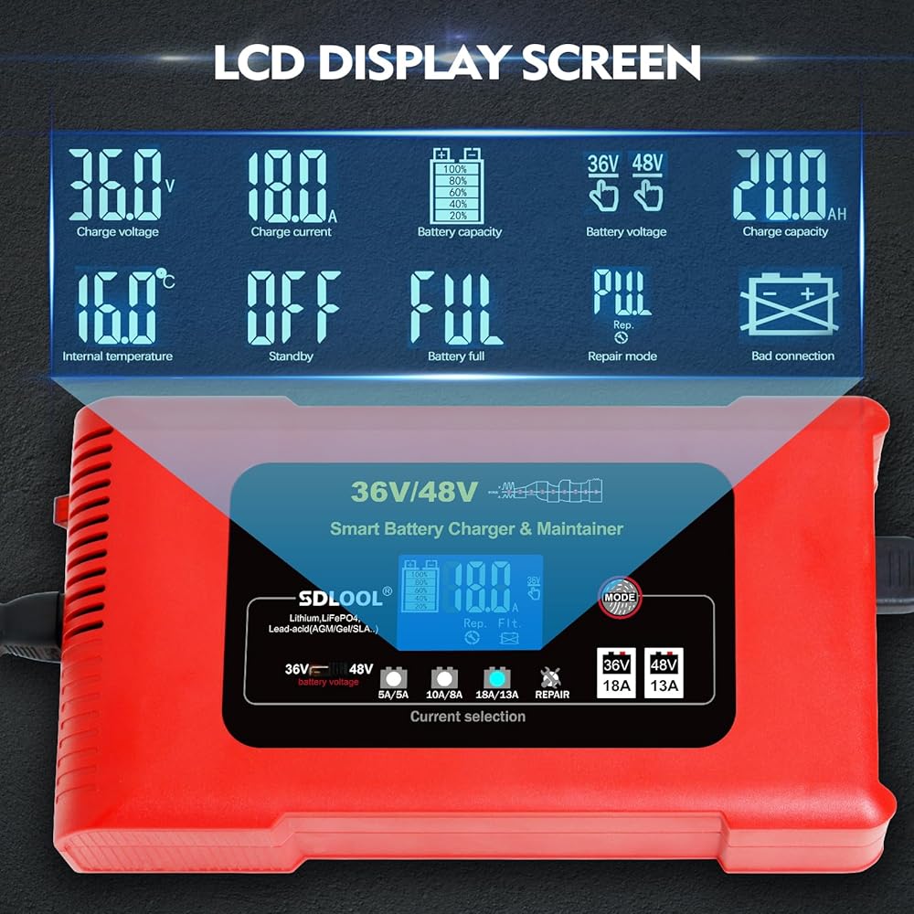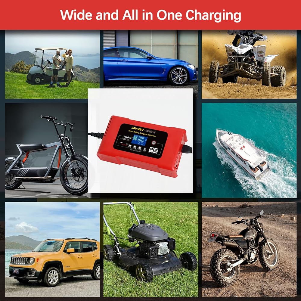 يستخدم على نطاق واسع: يأتي شاحن عربة الجولف هذا مع محول منفذ شحن عربة الجولف. إنه ليس فقط شاحن عربة جولف 36 فولت 48 فولت، ولكنه أيضًا شاحن عالمي للبطاريات يمكنه شحن الليثيوم، LiFePO4، حمض الرصاص (AGM، GEL، EFB، Flooded، MF، VRLA، SLA، WET، إلخ.).