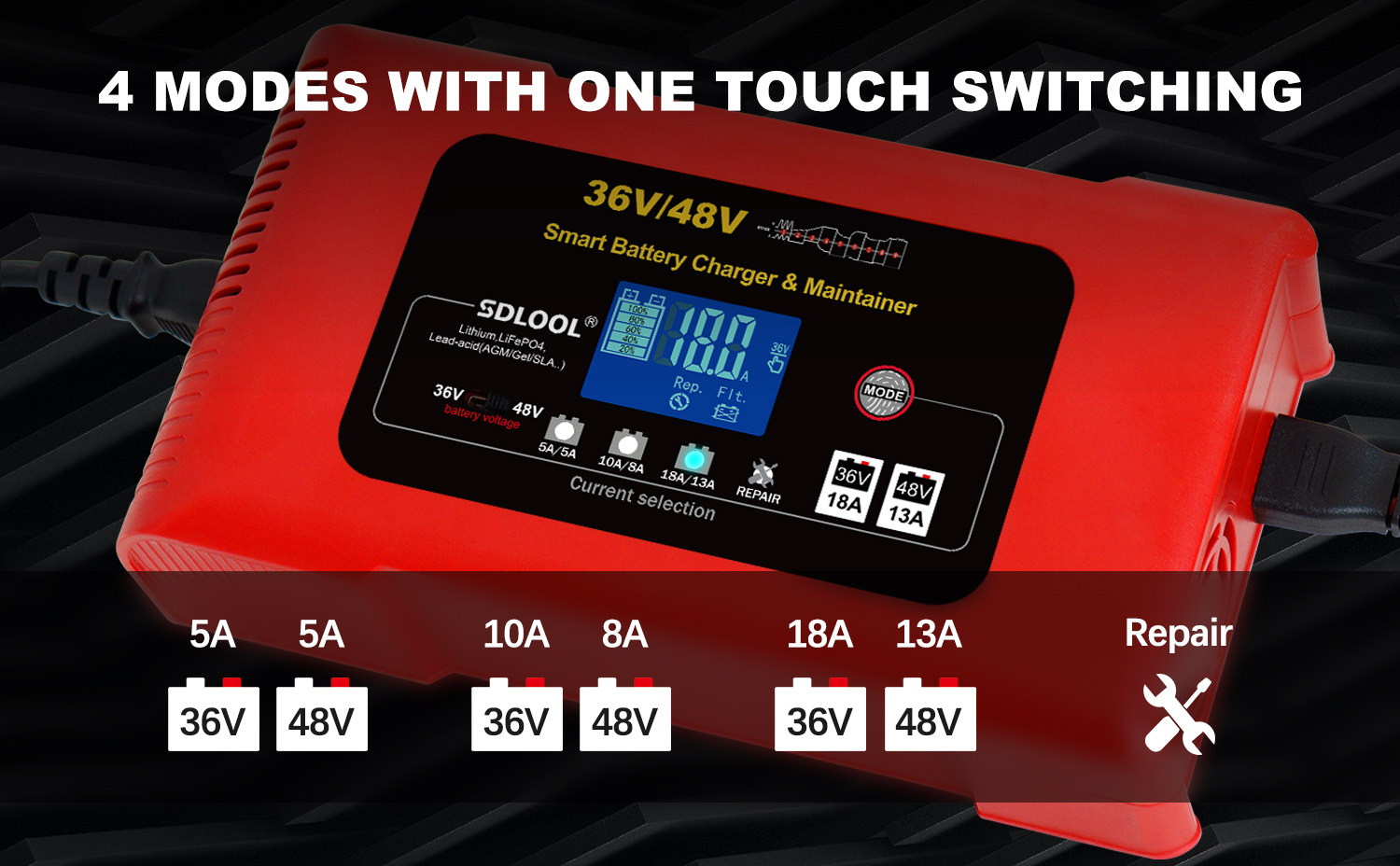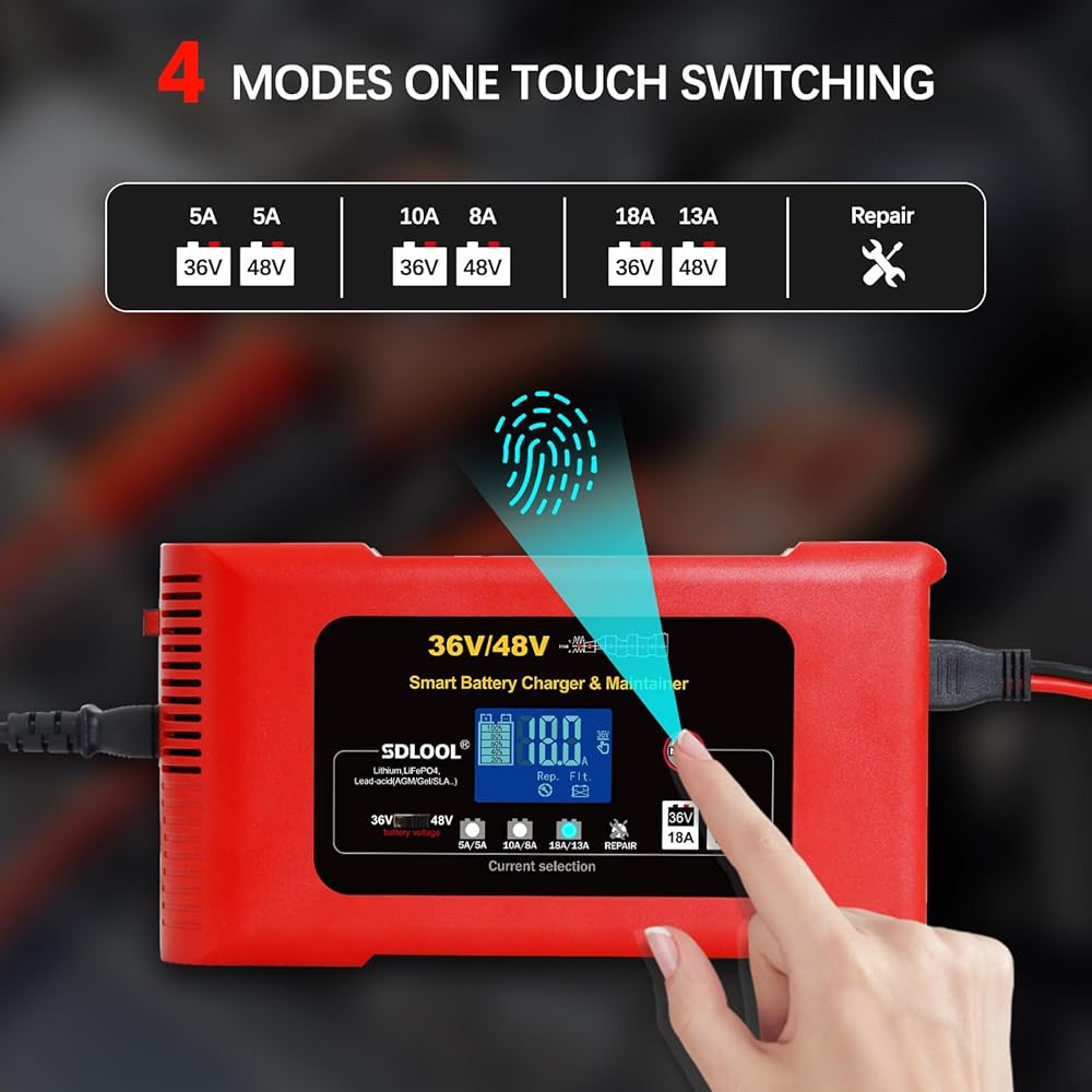تلقائي وذكي بالكامل: مع تقنية الشحن الذكي، يدخل شاحن البطارية في وضع "الاستعداد" عندما تكون البطارية مشحونة بالكامل. كل ما تحتاجه هو توصيل الطاقة، واختيار جهد البطارية وتيار الشحن، ولا داعي للقلق بشأن نسيان فصل الشاحن.