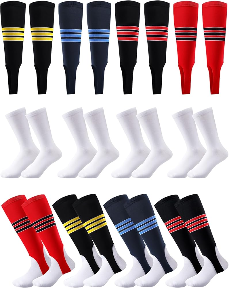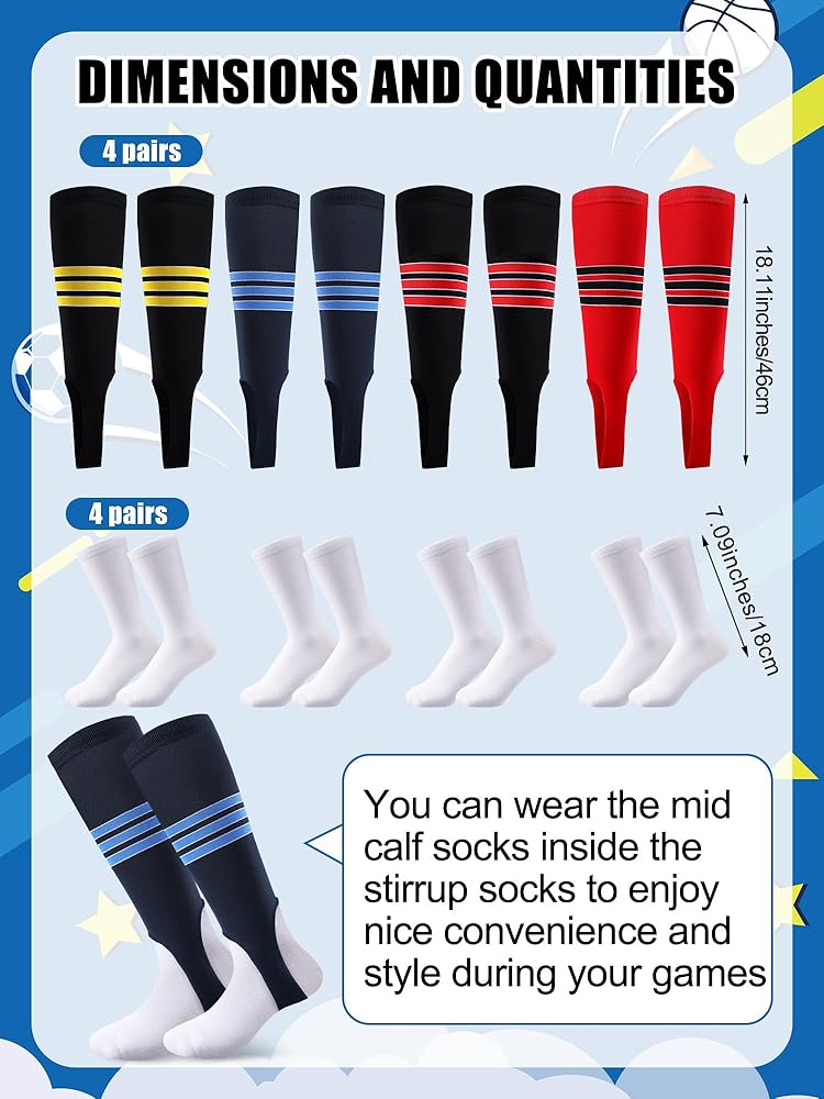 Product List: you will receive 4 pairs of striped baseball stirrups in 4 different colors and 4 pairs of sanitary liner baseball socks, enough quantity and styles for you and your baseball team to wear and use, you can also share them with your family and friends who play sports together
