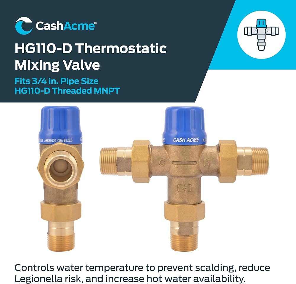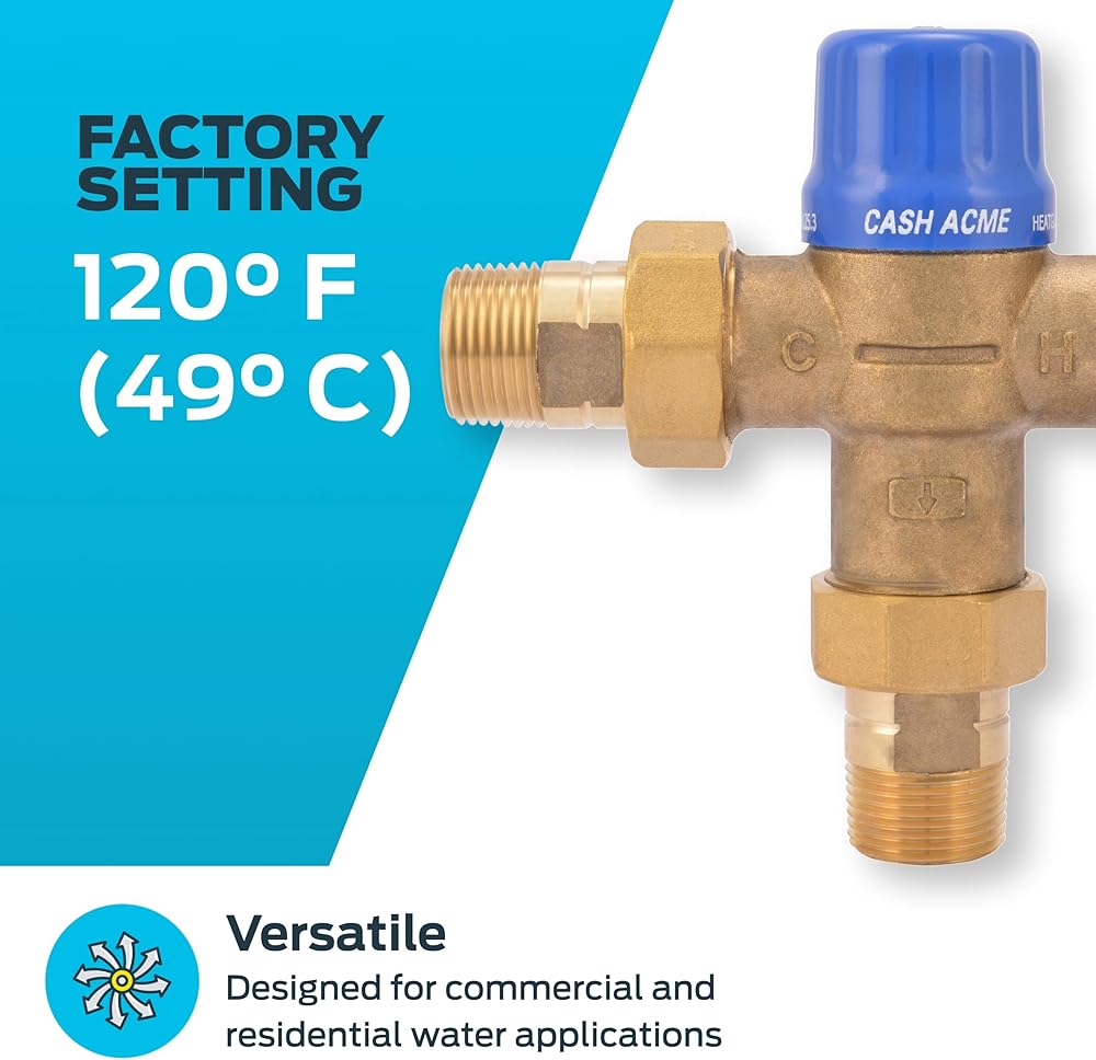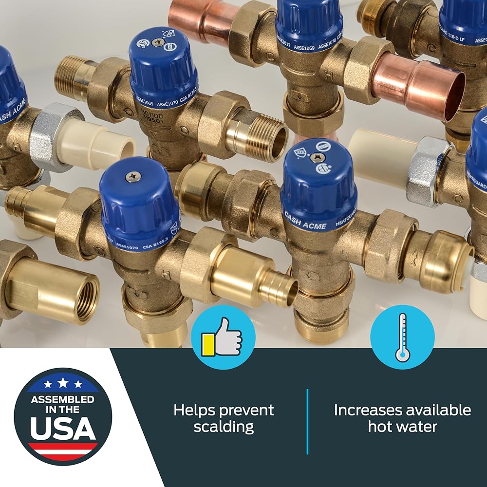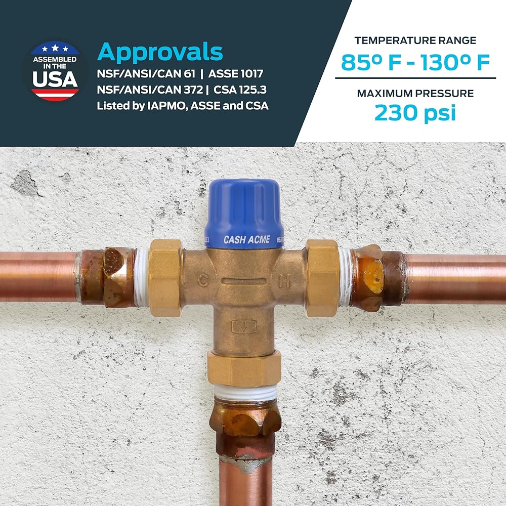 CASH ACME THERMOSTATIC MIXING VALVE: This triple-listed thermostatic mixing valve delivers water at a safe 120 degrees F or lower from all outlets, while allowing the water heater to be set at 140 degrees F or higher