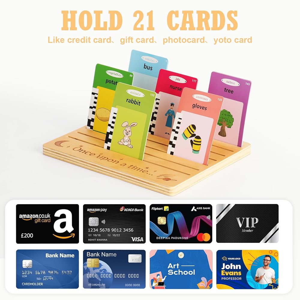 4.Wide application - Our Card Tray Organizer can not only help organize study cards, but also store other cards. For example, important credit cards, debit cards, ID cards, membership cards, photo cards, invoices, receipts, etc. This prevents loss and damage. In addition to storing cards, our Desktop Organizer can also be displayed. The wood color gives a very elegant appearance and makes your items more fashionable.