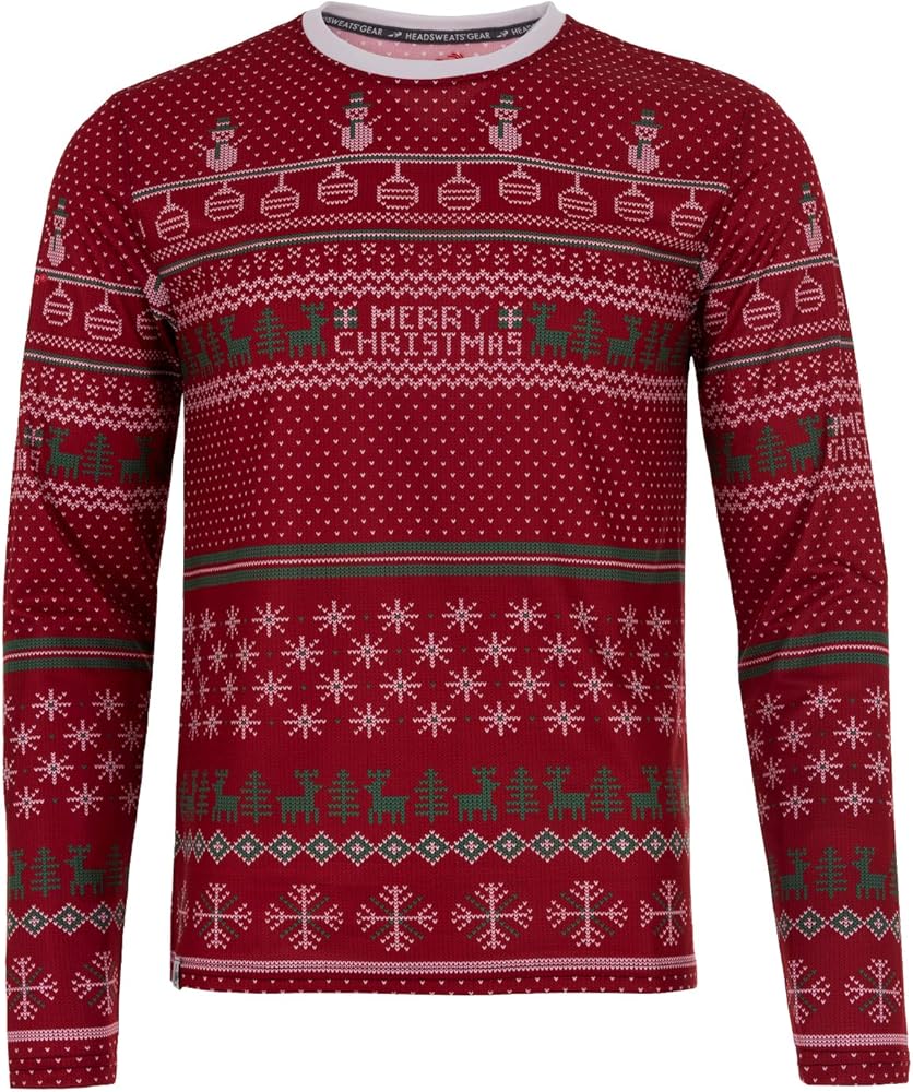 Functional, stylish, and Santa approved, this men's 'Ugly Christmas' long sleeve shirt features a sweater-like 'ugly' Santa-themed blue printed pattern design and will keep you on the nice list this year. Designed with an active fit and festive design, not only does this shirt deliver on performance, but it also can be worn as a casual tee when running errands or upcoming holiday events. The shirt's lightweight and breathable pintec fabric, made from REPREVE recycled polyester, feels extra soft next to the skin. And with built-in moisture-wicking to keep you dry and comfortable no matter the activity, this is a versatile shirt you can wear to the gym or the office Christmas party. Long sleeves provide the extra protection you need on chilly days out, and the crew-neck collar lies flat for easy layering when it gets frosty outside.