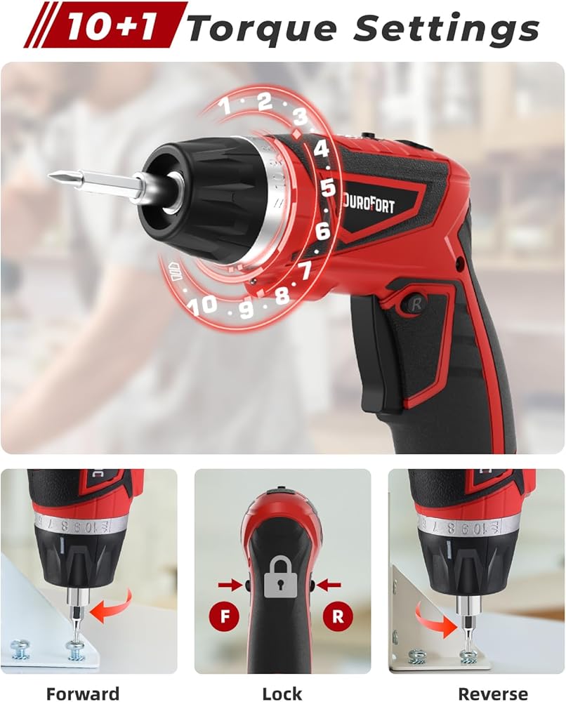 𝟏𝟎+𝟏 𝐓𝐨𝐫𝐪𝐮𝐞 𝐒𝐞𝐭𝐭𝐢𝐧𝐠 & 𝐅𝐨𝐫𝐫𝐝/𝐑𝐞𝐬𝐞𝐫𝐯 𝐞 𝐂𝐨𝐧𝐭𝐫𝐨𝐥: يوفر مفك البراغي الأوتوماتيكي DuroFort إعدادًا دقيقًا لعزم الدوران 10+1، وهو مصمم لمنع تجريد البراغي أو الإفراط في تحريكها. وهذا يضمن تجربة تثبيت مثالية، بغض النظر عن مدى تعقيد المهمة. يعمل المفتاح الأمامي/العكسي على تعزيز الراحة، مما يسمح بالانتقال السريع بين القيادة وإزالة البراغي