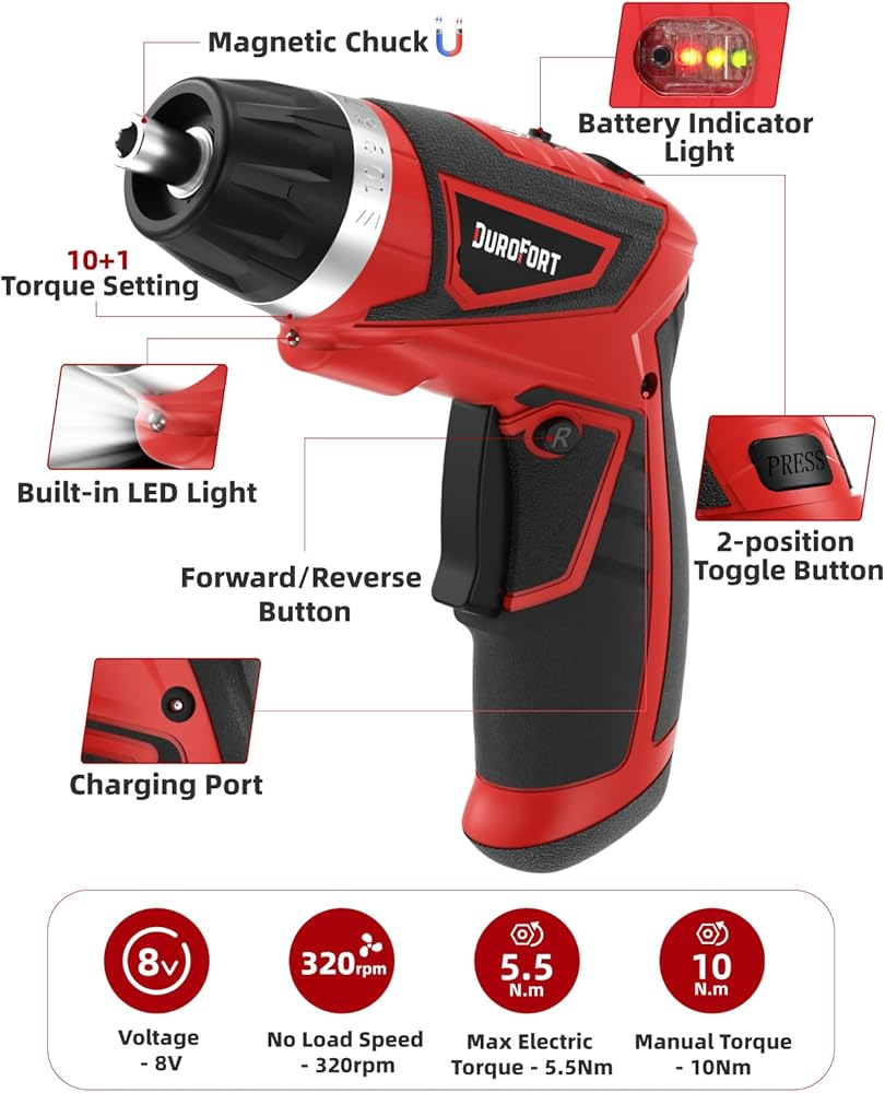 𝐏𝐨𝐰𝐞𝐫𝐟𝐮𝐥 𝟖𝐕 𝐌𝐨𝐭𝐨𝐫 & 𝐌𝐚𝐱 𝟏𝟎𝐍𝐦 𝐓𝐨𝐫𝐪𝐮𝐞: قل وداعًا عمل يدوي باستخدام مجموعة مفكات البراغي الكهربائية اللاسلكية القابلة لإعادة الشحن Durofort 8V، والتي تنتج عزم دوران أقصى يبلغ 10 نيوتن متر في الوضع اليدوي، وعزم دوران كهربائي أقصى يبلغ 5.5 نيوتن متر، وتتميز بسرعة عدم تحميل تبلغ 320 دورة في الدقيقة