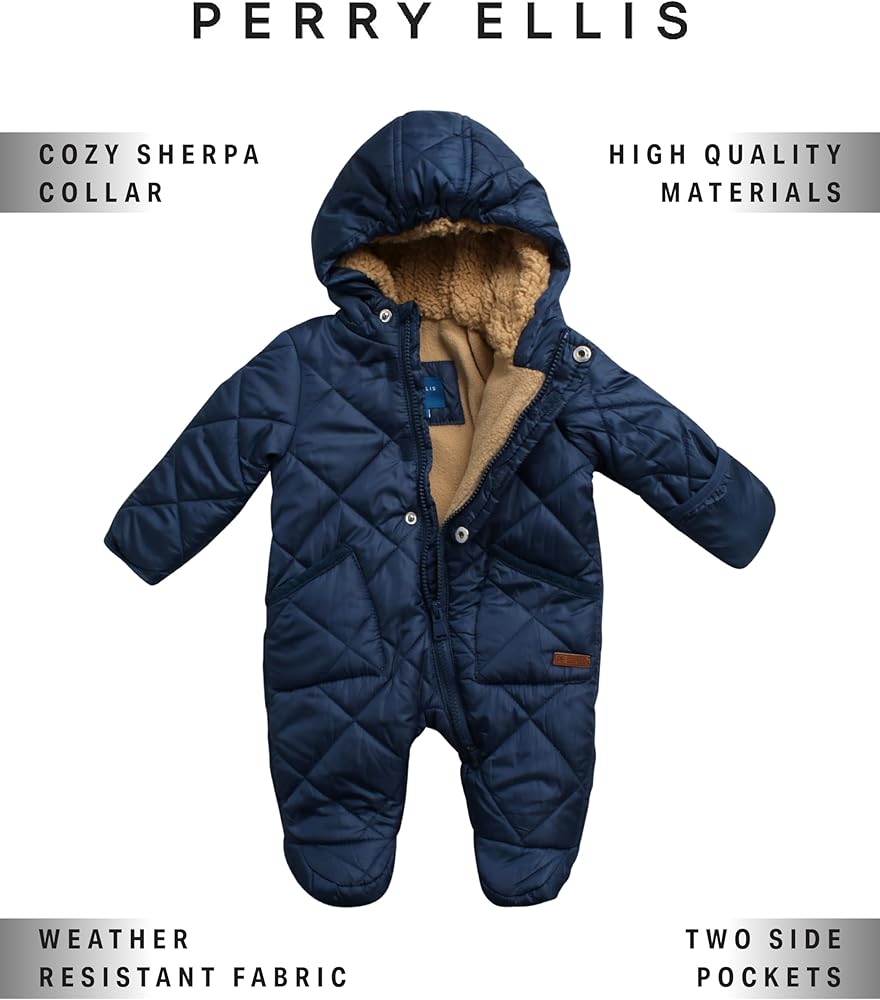 COZY COMFORT: Wrap your baby in warmth with the Perry Ellis Baby Boys' Pram Jumpsuit. Crafted from sueded microfiber and faux memory fabrics, this snowsuit ensures your little one stays snug and cozy on chilly days. The quilted construction provides an extra layer of insulation, keeping your baby protected from the cold.