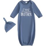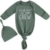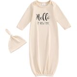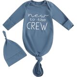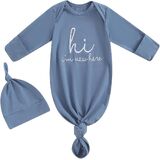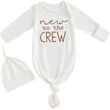DESIGN: Newborn knotted gown and hat set, long sleeve infant gowns, Hi I'm new here, New to the crew letter embroidered tie slpeeing bag, baby boy coming home outfits newborn baby nightgowns, infant sleeper baby sleep gown with mittens, cute unisex babies clothing, new born baby essentials must haves