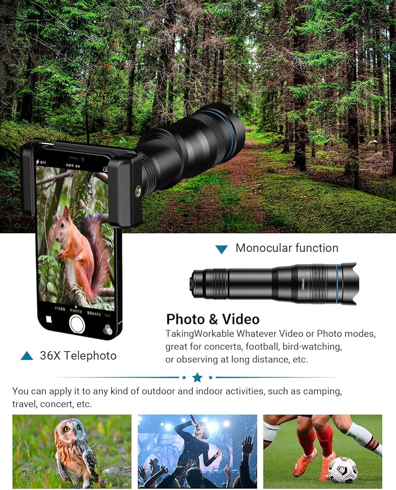 【عدسة هاتف قابلة للتعديل 36X تليفوتوغرافي 】: يمكن تعديل الطول البؤري لعدسة الهاتف المقربة عالية الطاقة 36X التي تمت ترقيتها حديثًا عن طريق تدوير حلقة التركيز، مما يجعل من السهل التقاط صور واضحة للأشياء على بعد أميال. ويمكن استخدامه أيضًا كتلسكوب أحادي بسيط لمراقبة المناظر الطبيعية والأشياء البعيدة، وهو رفيق لا غنى عنه لعشاق الصيد في الهواء الطلق ومصوري السفر في الهواء الطلق.