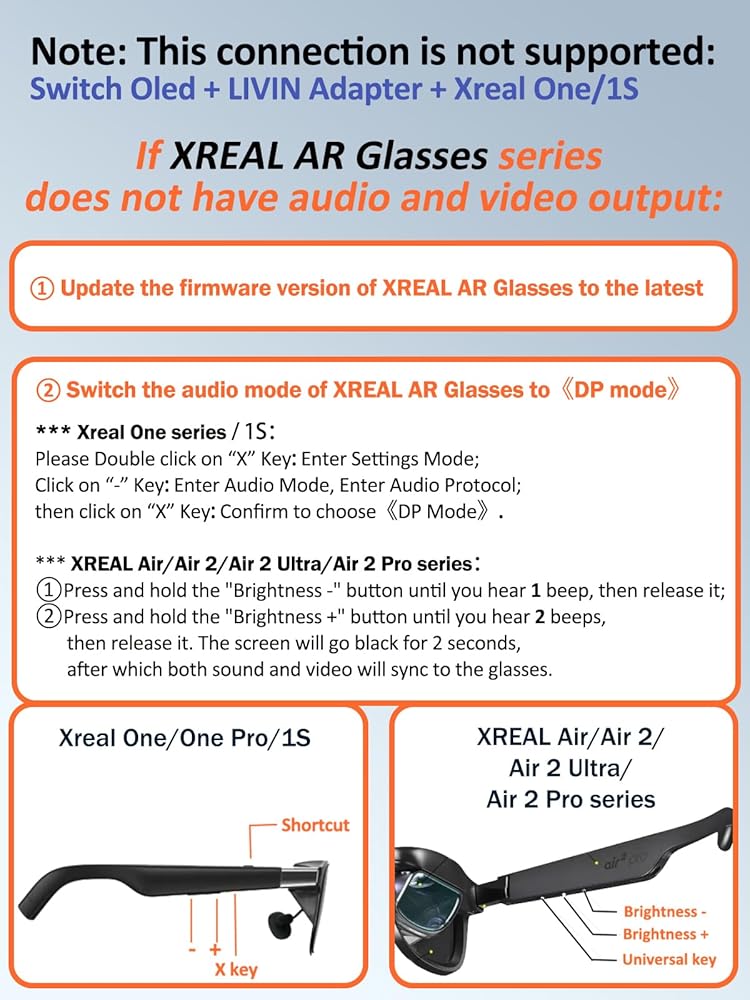 【ملاحظة】: 1. يرجى تحديث إصدار البرنامج الثابت لنظارات الواقع المعزز إلى الأحدث. 2. إذا كان المحول لا يعمل بشكل صحيح، فيرجى إعادة توصيل منفذ (USB-C OUT) الخاص بالمحول. 3. إذا كانت هناك حاجة إلى توصيل/فصل المحول عن الطاقة، فأعد توصيل منفذ (USB-C OUT) الخاص بالمحول. 4. يرجى التأكد من أن الجهاز المتصل يدعم نقل الصوت والفيديو. 5. لا يمكن عكسه. 6. لا يمكن توصيله بمحولات أخرى. 7. يرجى الاتصال بـ:[email protected]