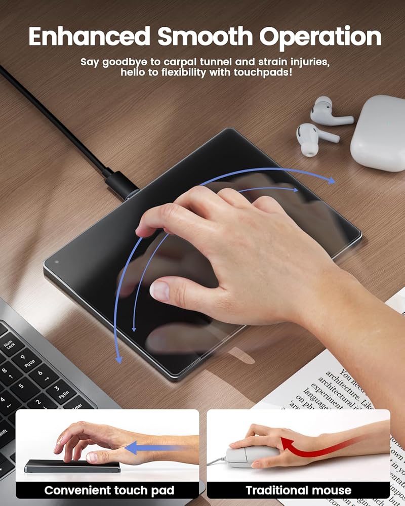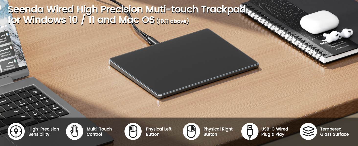 التوصيل والتشغيل والاتصال المستقر USB-C - تم تصميم لوحة التتبع Seenda USB لتوفير الراحة، وجاهزة للاستخدام على الفور مع توصيل بسيط بمنفذ USB بجهاز الكمبيوتر الخاص بك، ولا تتطلب أي برامج تشغيل إضافية للتشغيل. فهو يستفيد من اتصال USB-C للحصول على موثوقية واستقرار لا مثيل لهما، مما يضمن استخدامًا سلسًا للوحة اللمس دون أي مشاكل في الاتصال. تخلص من الإعدادات المعقدة واستمتع بتجربة حوسبة سلسة مع هذا التصميم سهل الاستخدام