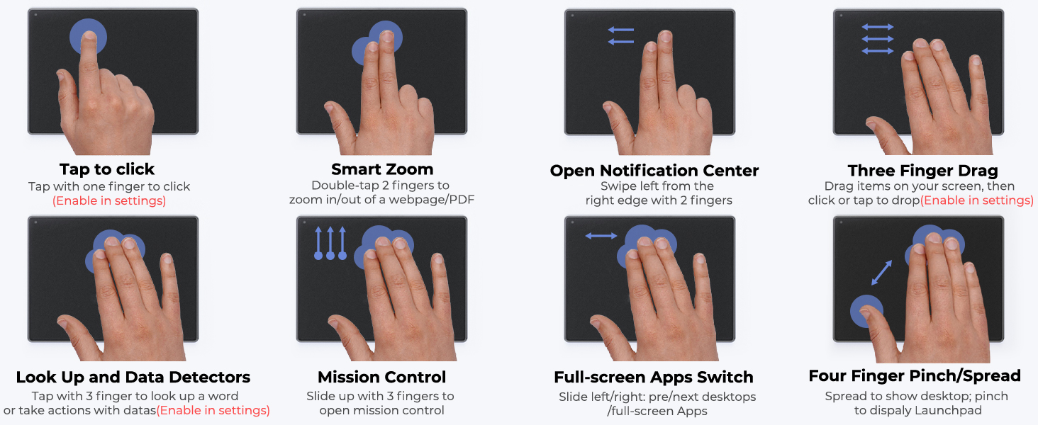 لوحة تتبع كاملة الحجم مع خاصية اللمس المتعدد - تم تصميم لوحة اللمس الخارجية من سيندا مع عناصر تحكم متعددة اللمس تصل إلى 4/5 إيماءات أصابع، مما يجعل من السهل الاختيار والسحب والتكبير/التصغير والتمرير والبحث وتبديل المهام وفتح التحكم في المهام أو تصغيره إلى سطح المكتب أو عرض Launchpad والمزيد. تتميز بشاشة لمس كبيرة مقاس 6.3 بوصة، ومنطقة لمس واسعة مقاس 5.4 × 4 بوصة، وشكل جانبي نحيف للغاية يبلغ 0.16-0.24 بوصة، متجاوزًا نحافة لوحة التتبع السحرية
