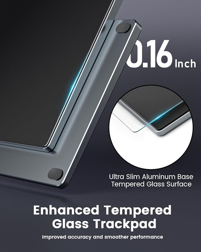 لوحة لمس معدنية وزجاج مقسى محسّن - استمتع بسلاسة وكفاءة لا مثيل لهما مع لوحة التتبع المحدثة لجهاز Mac من Seeda، والتي تتميز بسطح زجاجي مقوى من الحافة إلى الحافة لتوفير راحة فائقة أثناء الاستخدام. تضمن قاعدتها المعدنية القوية، إلى جانب وسادات مضادة للانزلاق، أقصى قدر من الثبات. تم تصميمه من أجل الأناقة والعملية، وهو يندمج بسلاسة في أي مساحة عمل، مما يسمح بالتنقل دون عناء