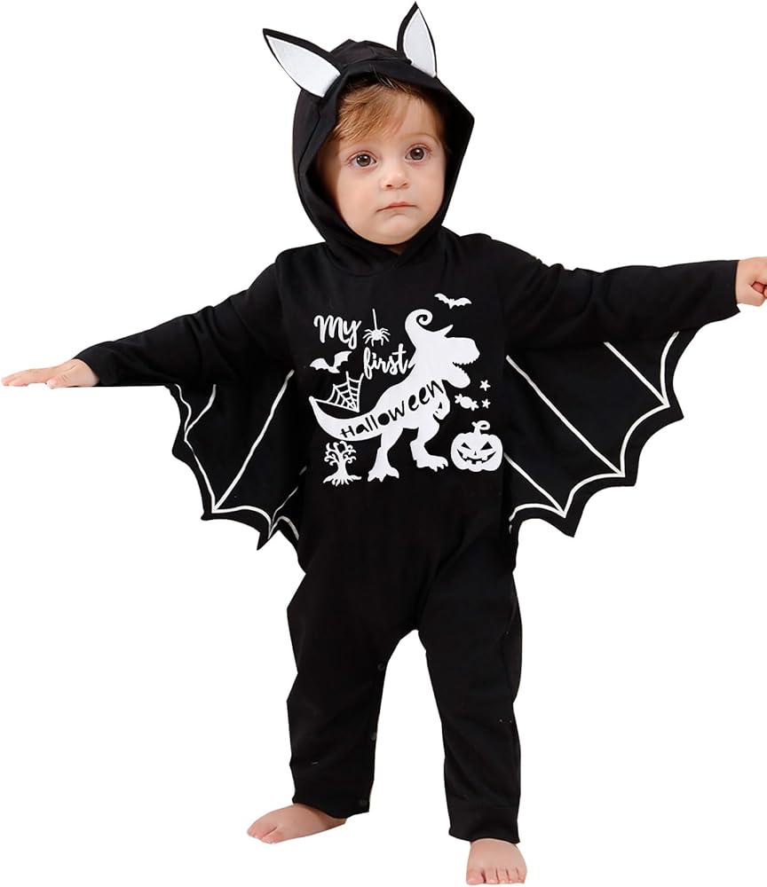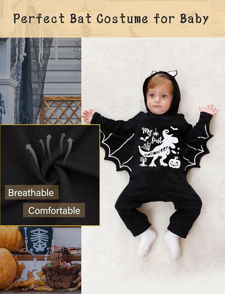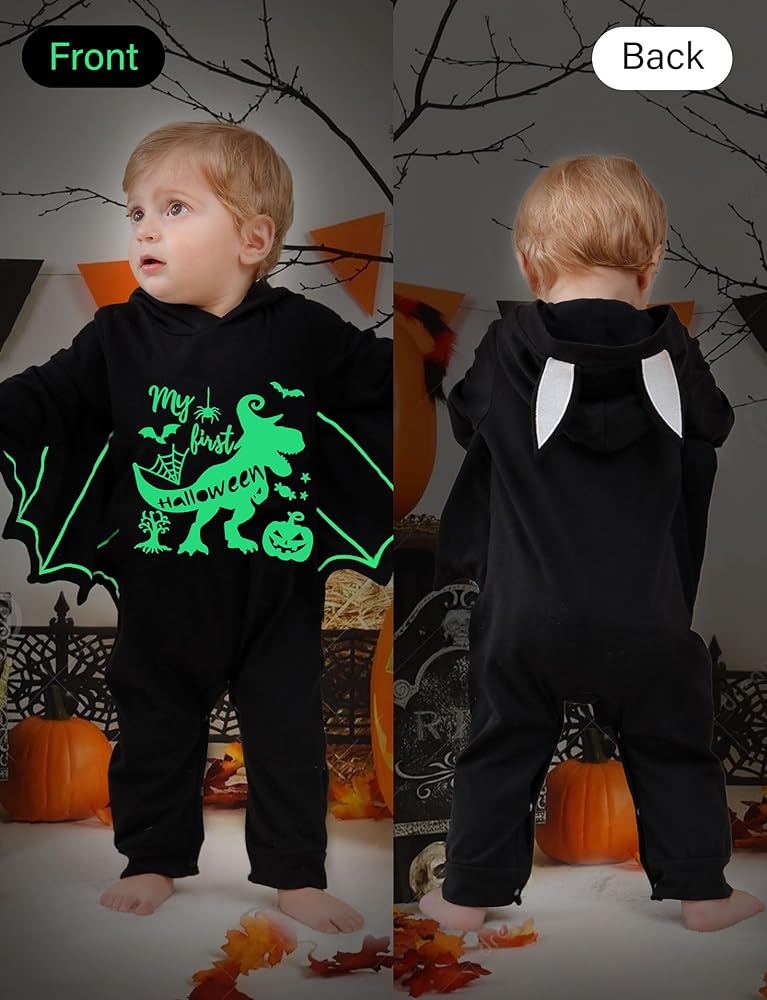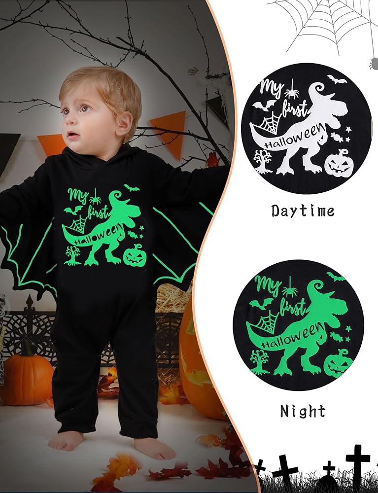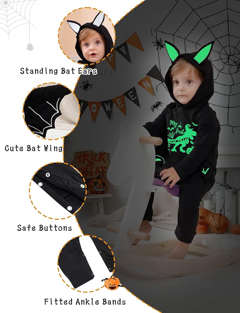تصميم يتوهج في الظلام: يتوهج النمط الأبيض لرومبر الهالوين في الليل، وهو بالتأكيد تصميم غير موجود في المنتجات المماثلة. سيبدو طفلك وكأنه خفاش حقيقي فيه، ويضيف التصميم المتوهج المزيد من متعة الزي