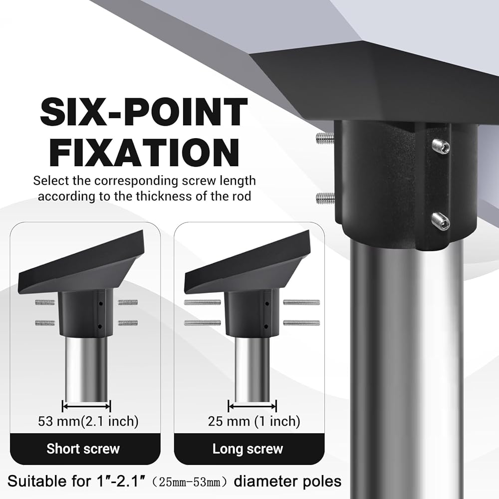 آمنة ومستقرة: مع 12 مسمارًا ومفتاح سداسي، تشكل البراغي الستة هيكلًا مثلثًا ثابتًا، والذي لا يضمن ثباتًا أكبر فحسب، بل يسهل أيضًا المحاذاة أثناء التثبيت. يمكن تركيبه على الأسطح والجدران والأعمدة الأرضية لسهولة وضعه.