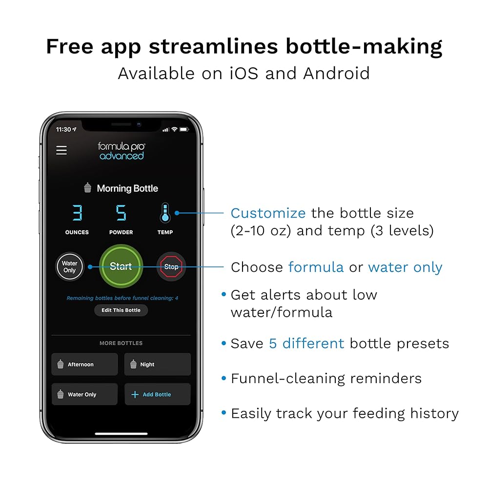 • Same patented mixing technology as #1 selling Formula Pro Advanced except with FREE App that offers unique benefits including 1) Pre-set 4 different bottles & 2) get alerts on your phone including low water/formula and no bottle present