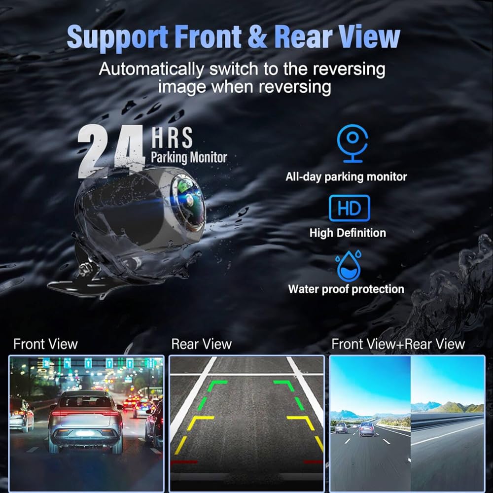 كاميرا مزدوجة: كاميرا أمامية مدمجة بدقة 2K من Carplay وكاميرا احتياطية عكسية مقاومة للماء بدقة 1080 بكسل، سجل بفيديو 2.5K H.264، وقناتان للفيديو محفوظتان بشكل منفصل.