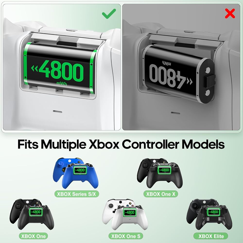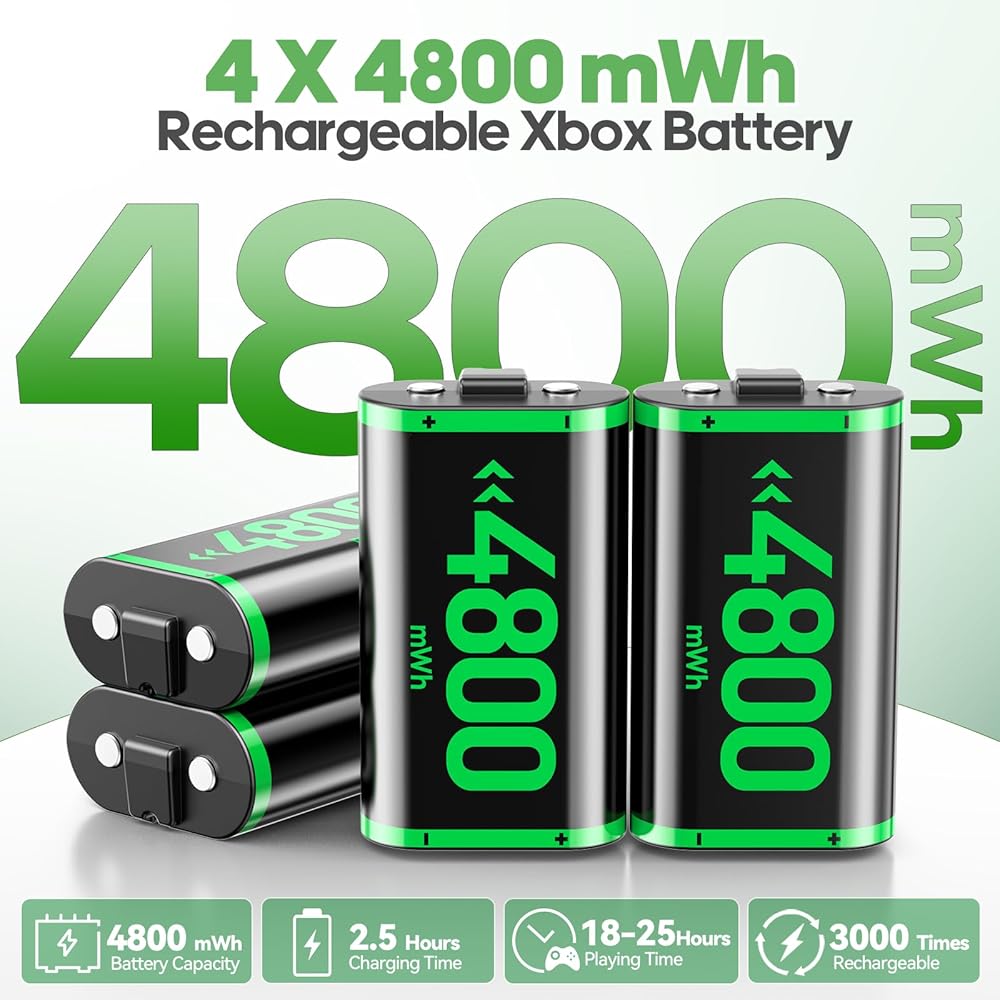 حزمة بطارية وحدة تحكم Xbox عالية السعة: تأتي حزمة بطارية Xbox القابلة لإعادة الشحن مع الشاحن مع 4 بطاريات Xbox عالية السعة قابلة لإعادة الشحن بقدرة 4800 مللي أمبير في الساعة ومحطة شحن RGB أنيقة تعمل مع Xbox Series X|S/Xbox One/Xbox One S/Xbox وحدات تحكم X/Elite/Core واحدة، مما يسمح لك بالاستمتاع بجلسات لعب ممتدة دون القلق بشأن موت وحدات التحكم. مع مجموعات بطاريات Xbox هذه التي يمكن إعادة تدويرها حتى 3000 مرة، يمكن لشاحن بطارية Xbox أن يوفر لك الكثير من المال ويحمي البيئة، مما يجعله بديلاً رائعًا لبطاريات AA العادية.