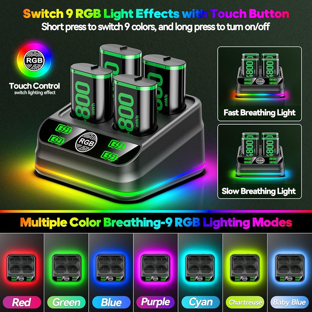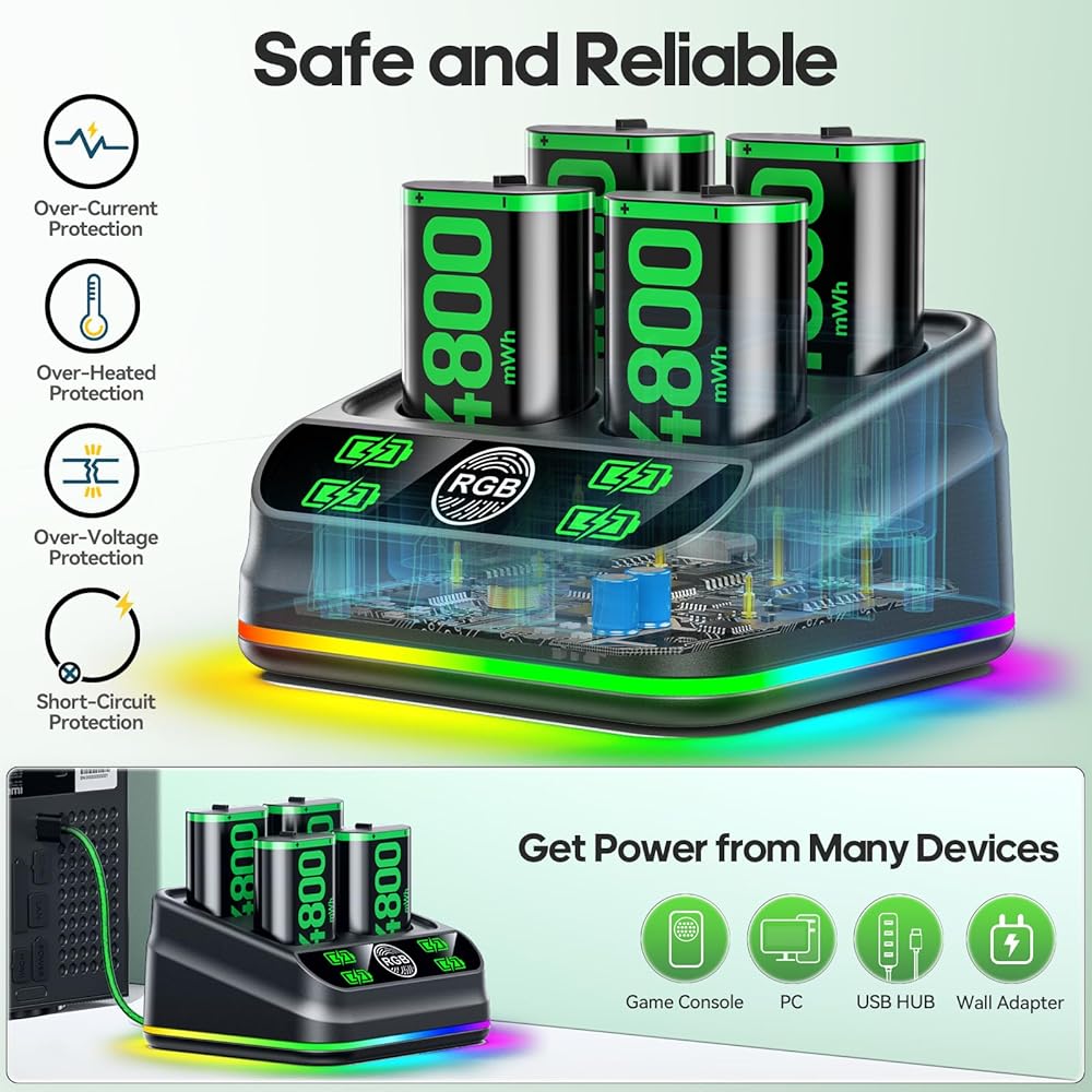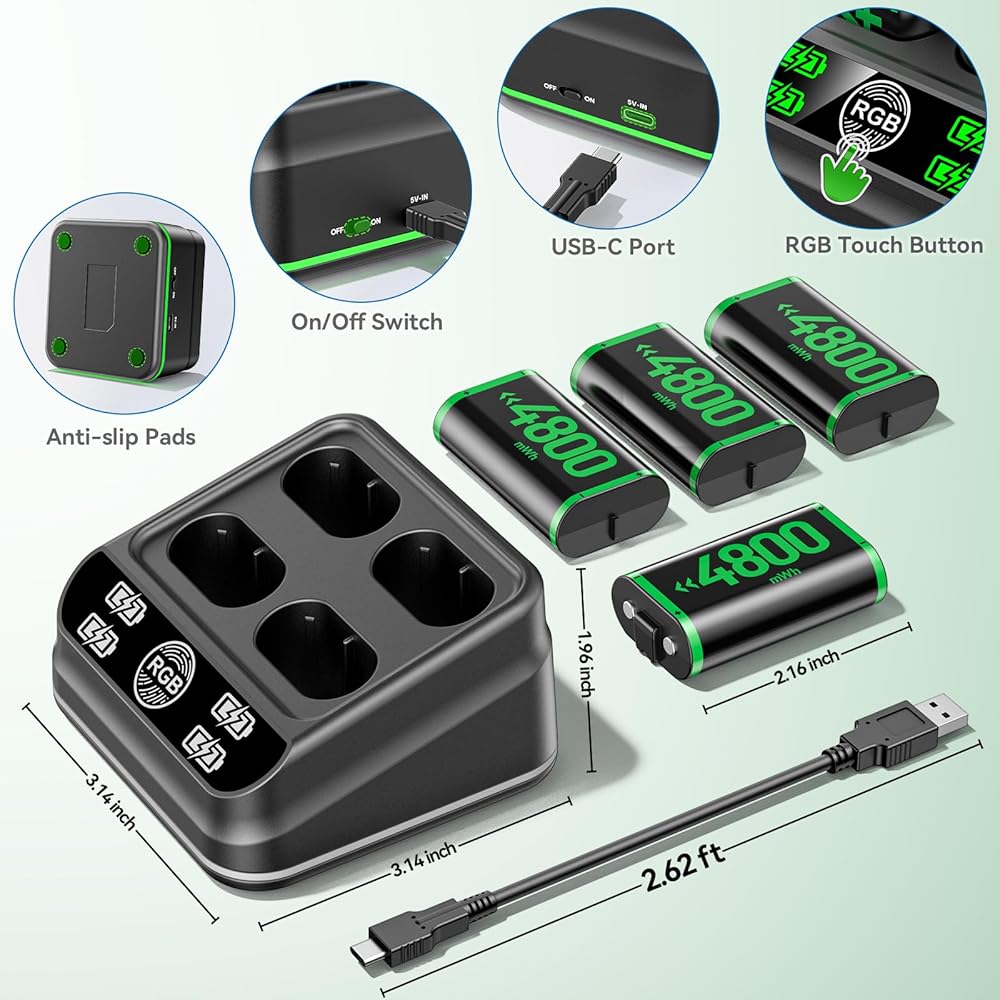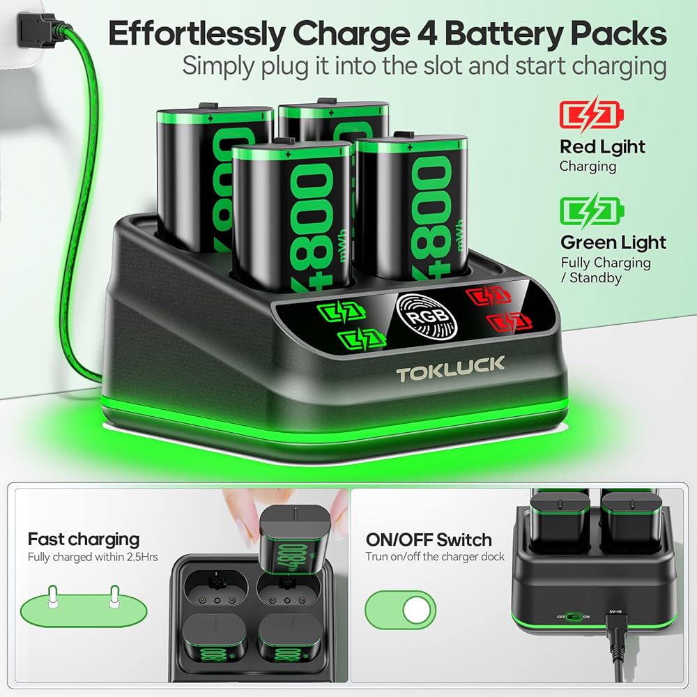 شحن سريع لمدة 2.5 ساعة 4 × 4800 ميجاوات في الساعة بطاريات Xbox قابلة لإعادة الشحن مع شاحن RGB بتصميم صغير
