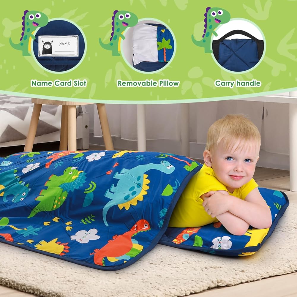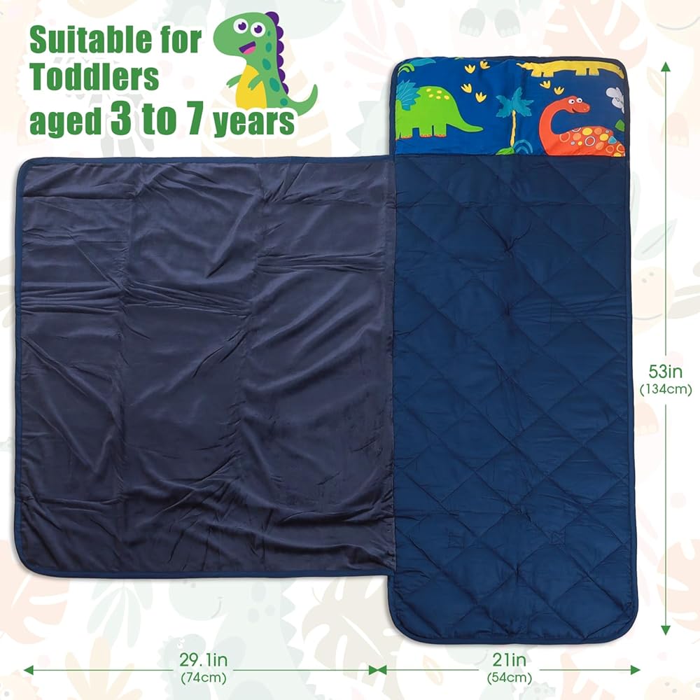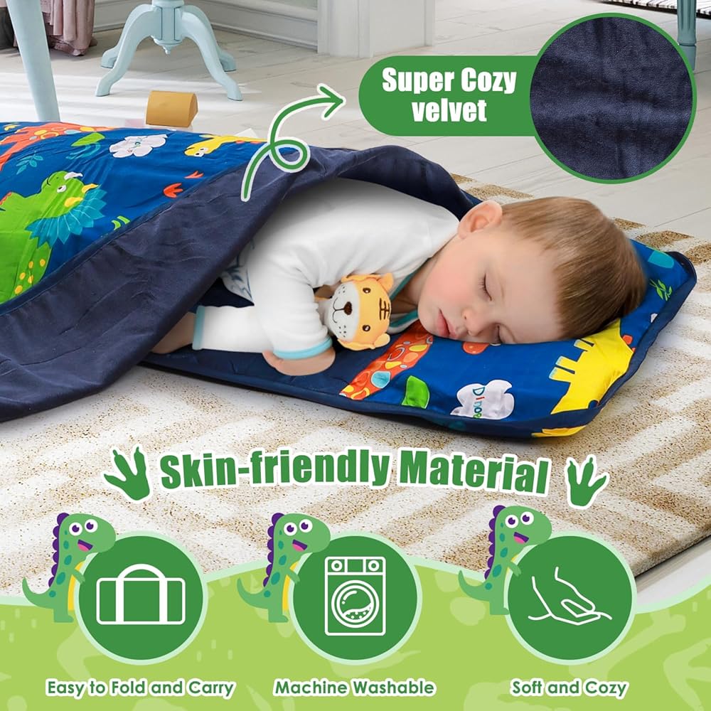 سجادة قيلولة للأطفال الصغار مع وسادة وبطانية، مصنوعة من القطن بنسبة 100% مع حشوة من الألياف الدقيقة، سجادات نوم محمولة للأطفال للعناية النهارية ومرحلة ما قبل المدرسة، مقاس 21 بوصة × 53 بوصة، أكياس نوم خفيفة الوزن وناعمة