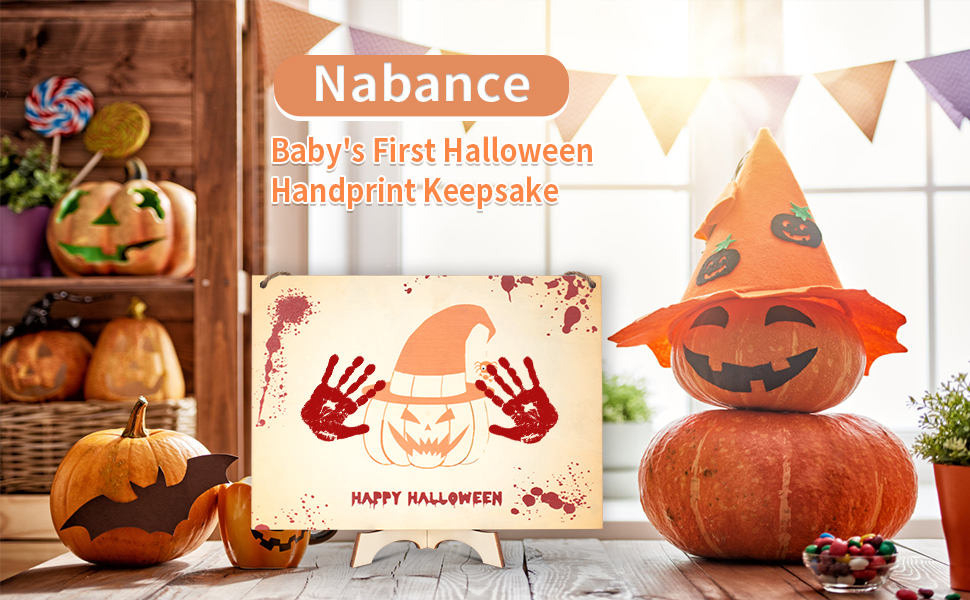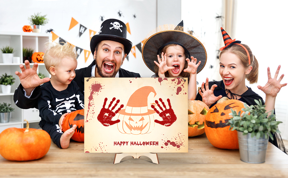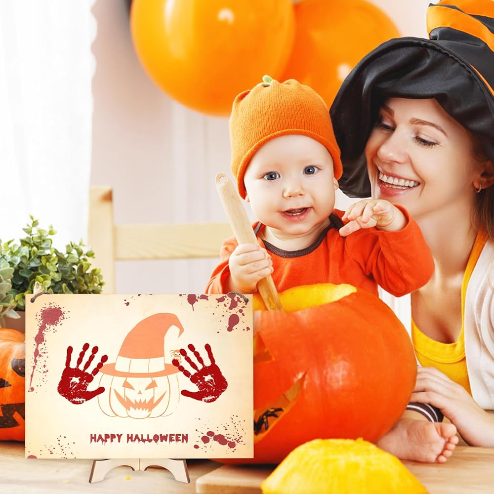 مطبوعات اليقطين، جو احتفالي: تتميز لوحة بصمة يد الطفل بطبعات اليقطين التي لا تعزز الجو التقليدي للهالوين فحسب، بل تجعل الديكور أكثر إثارة للاهتمام وحيوية. تصميم مطبوعات اليقطين يتوافق تمامًا مع موضوع الهالوين، مما يجعله مناسبًا لتزيين العطلات أو الهدايا