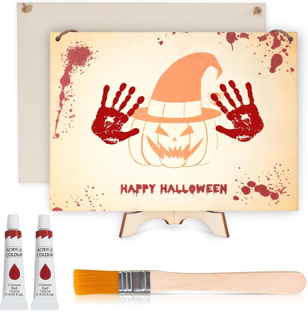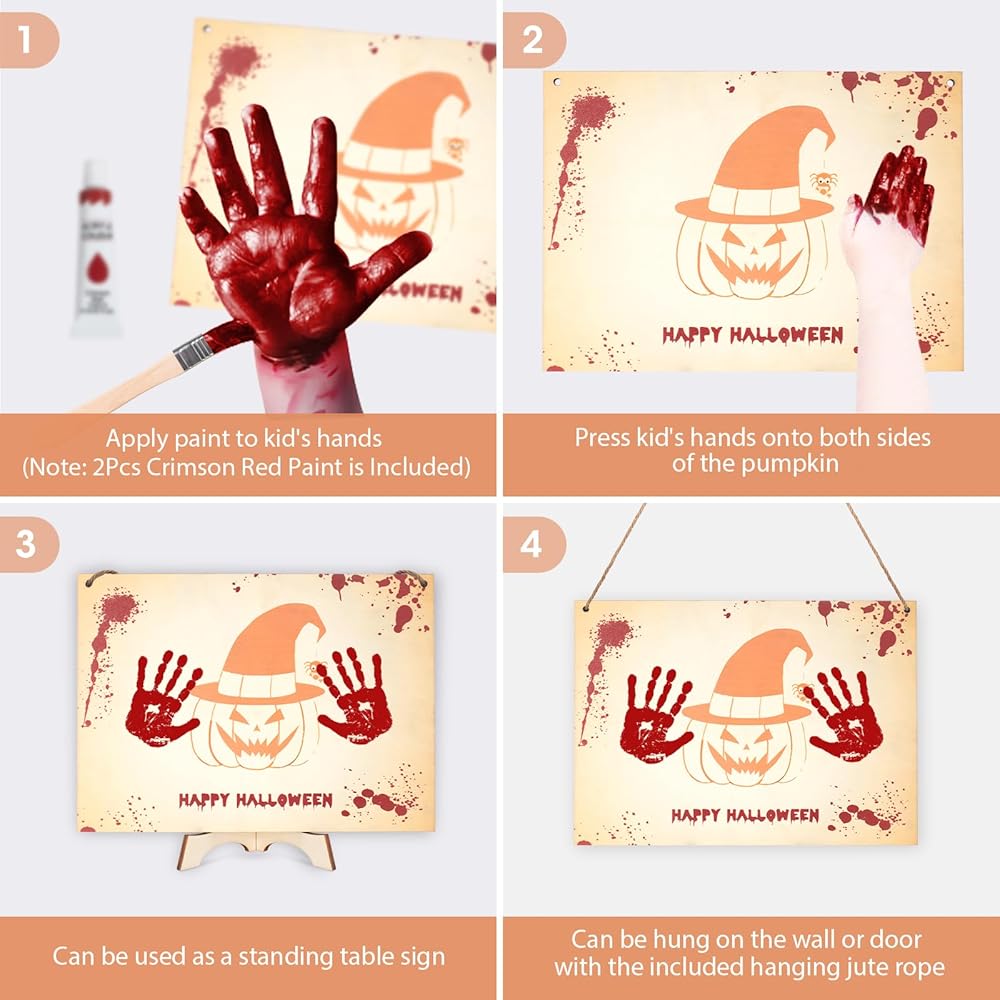 مجموعة الأعمال الفنية لبصمة اليد للهالوين، لوحة خشبية على شكل قرع اليد الأولى للهالوين، هدية للأطفال الصغار والآباء الجدد، هدية تذكارية للعائلة، ديكور الهالوين، علامة خشبية معلقة