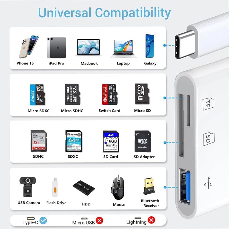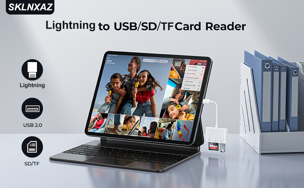 • [ملحقات لهاتف iPhone مع فتحات بطاقة مزدوجة]: قارئ بطاقة الذاكرة SKLNXAZ لجهاز iPhone يدعم بطاقة SD وبطاقة TF، وبطاقة رقمية آمنة (SD/SDHC) وبطاقة Micro SD(TF). لا تدعم بطاقة ذاكرة Wi-Fi SD.