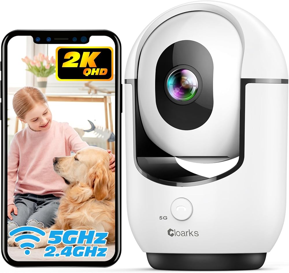 كاميرا داخلية 2K، كاميرا أمان WiFi Pan/Tilt بتردد 5/2.4 جيجا هرتز مع كشف حركة AI، مكالمة بنقرة واحدة لمراقبة الطفل، كاميرا سلكية للحيوانات الأليفة مع صوت ثنائي الاتجاه، 24/7، إنذار صفارة الإنذار، تخزين TF/سحابي