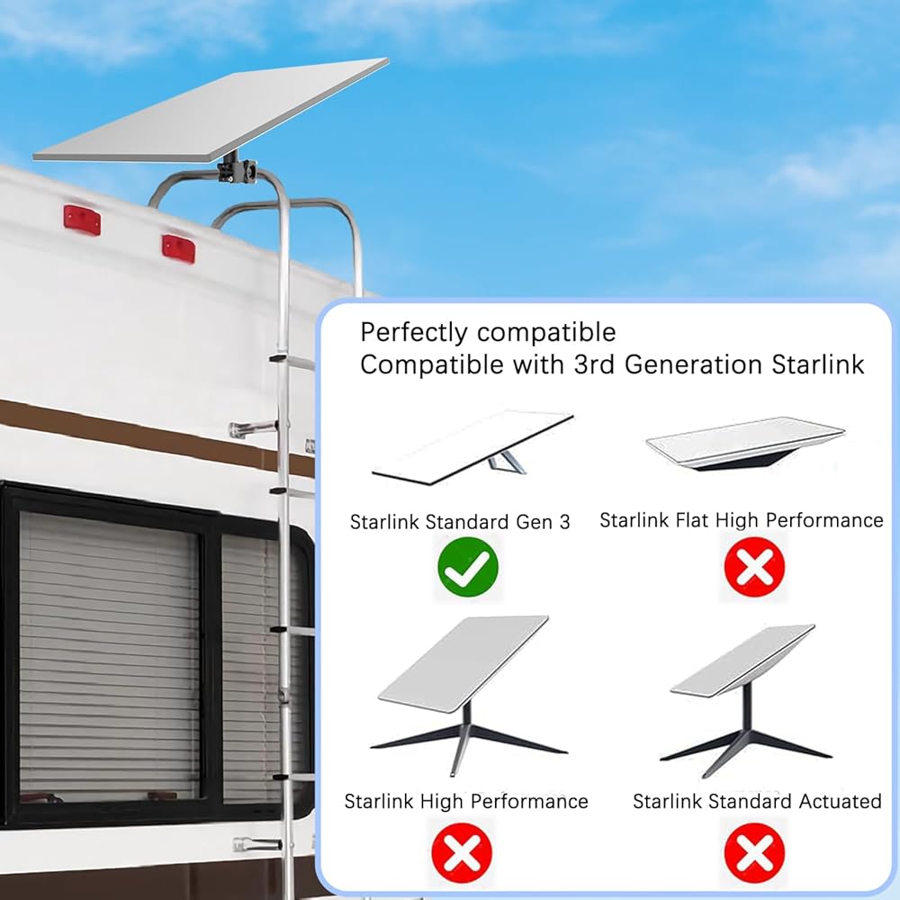 تركيب متعدد الاستخدامات: يوفر حامل السلم Starlink gen 3 rv خيار تركيب محمول ومتعدد الاستخدامات لطبق Starlink الخاص بك. مع محول أنبوب ستارلينك، يمكن تركيبه بأمان على أي سلم أو عمود من 0.8-1.17 بوصة، مما يجعله الحل الأمثل للتركيب على الأعمدة أو الأسطح أو المركبات الترفيهية أو سيارات الدفع الرباعي أو أي سطح خارجي.