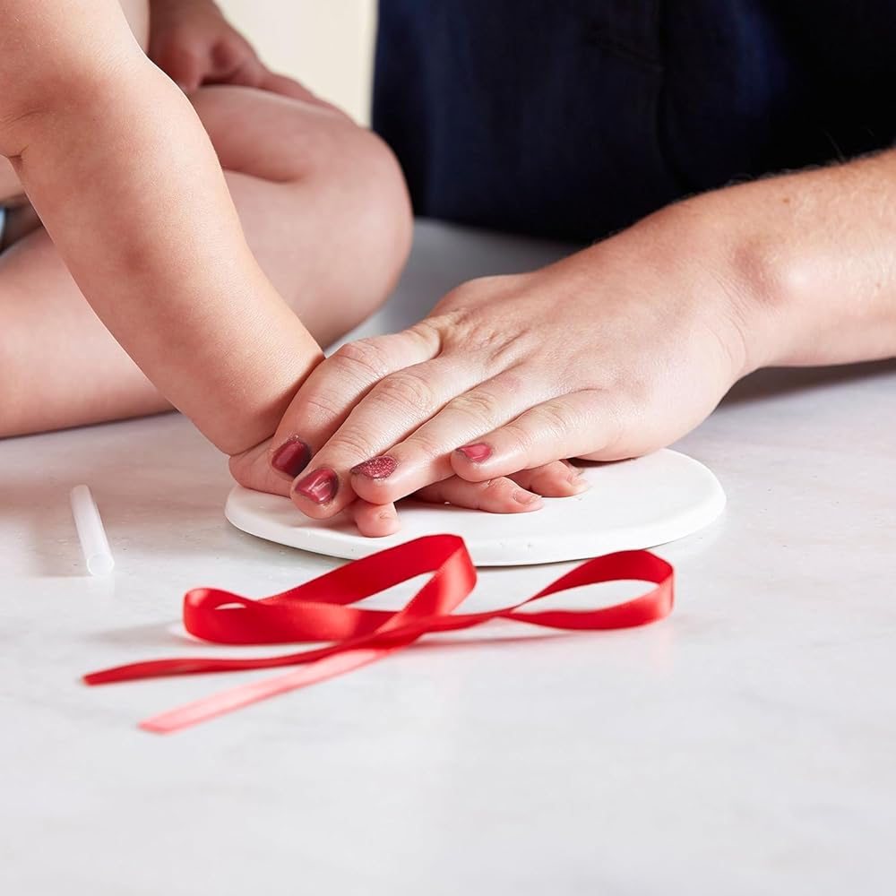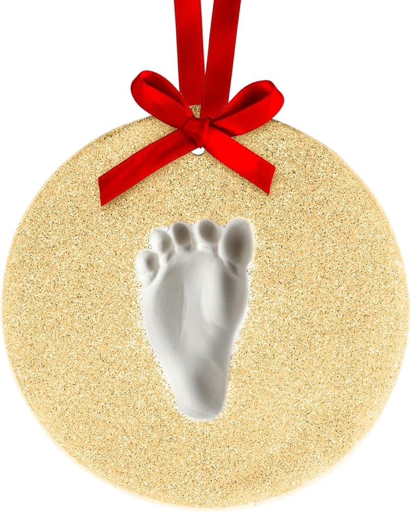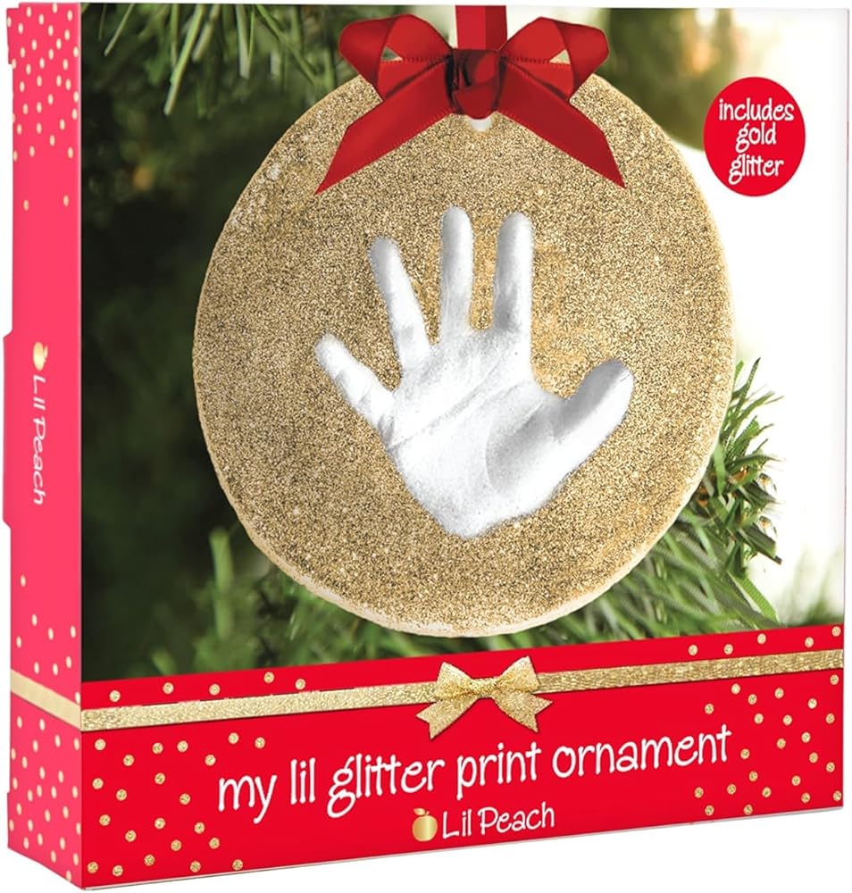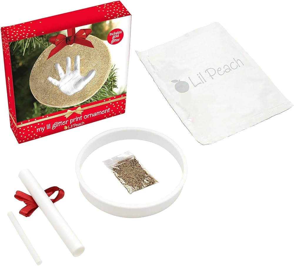 Celebrate the holiday season with the Lil' Peach My Lil' Glitter Print Christmas Ornament. Each winter when the year winds down, you'll find your little one just a little bigger and a touch more independent. With the Lil' Peach My Lil' Glitter Print Christmas Ornament, your family can start a unique holiday tradition right from baby's first Christmas. Each year you'll remember all the precious Christmas memories when you unwrap this holiday decoration and look at the small impression of your baby's handprint. The unique heart shape and shimmering flecks of glitter complete this festive keepsake. The Lil' Peach Glitter Print Ornament Kit is simple to use as well. This kit includes everything you need to make a clay handprint ornament. You'll receive no-mess impression clay, bag of gold glitter, a rolling pin, a plastic hole punch and cutting ring for shaping, along with a colorful red ribbon so it's ready to hang. The clay boasts a non-toxic, baby-safe formula that's ready mold and shape with a sweet little handprint front and center. Tips and tricks: for best handprint or footprint make sure baby is fed, changed and calm. Use rolling pin to form impression material to desired thickness. Flatten baby's feet or hands and press against the impression clay. Once you've made baby's impression, pour included glitter over print and use the roller to imbed glitter into ornament by lightly pressing the roller over the print. Cut, shape and punch a hole for the ribbon. Be sure to allow the ornament to fully dry before hanging. Your tree ornament is ready for display. This kit can be used with infants and children with hands up to five inches in diameter and feet up to five inches long. Make sure to include this handprint kit on your baby gift registry. And, this charming keepsake also makes a perfect holiday gift, Christmas gift, Mother's gift, Grandparent's gift or baby shower gift. Finished Dimensions: 6” W x 6” H x 0.5” D.