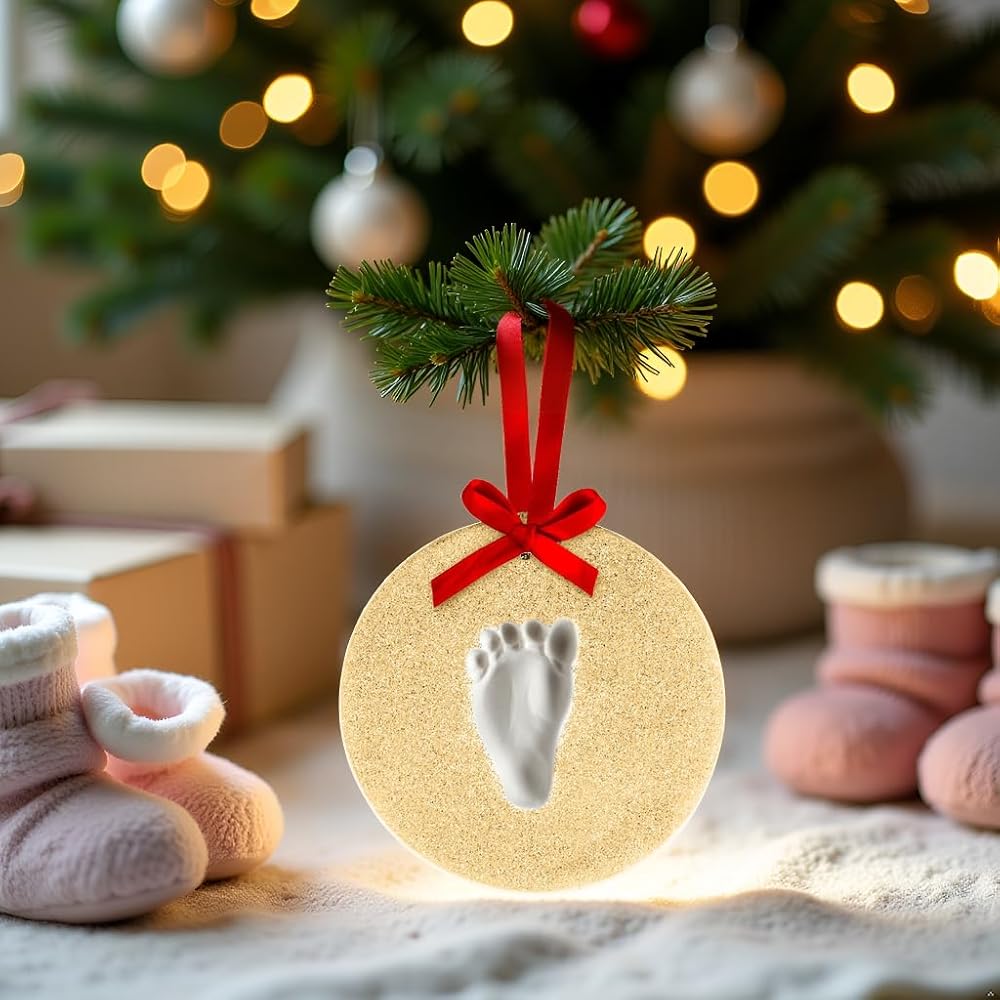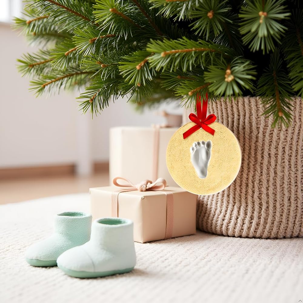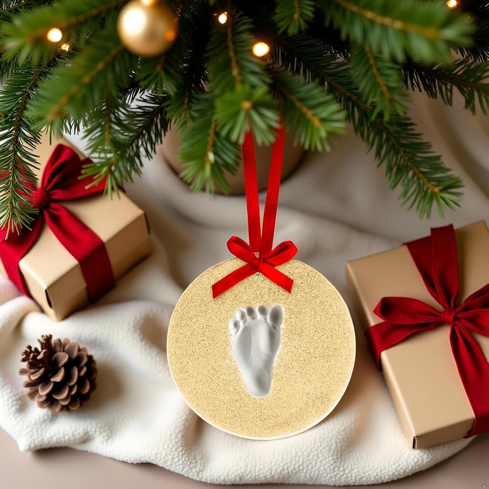 Celebrate the holiday season with the Lil' Peach My Lil' Glitter Print Christmas Ornament. Each winter when the year winds down, you'll find your little one just a little bigger and a touch more independent. With the Lil' Peach My Lil' Glitter Print Christmas Ornament, your family can start a unique holiday tradition right from baby's first Christmas. Each year you'll remember all the precious Christmas memories when you unwrap this holiday decoration and look at the small impression of your baby's handprint. The unique heart shape and shimmering flecks of glitter complete this festive keepsake. The Lil' Peach Glitter Print Ornament Kit is simple to use as well. This kit includes everything you need to make a clay handprint ornament. You'll receive no-mess impression clay, bag of gold glitter, a rolling pin, a plastic hole punch and cutting ring for shaping, along with a colorful red ribbon so it's ready to hang. The clay boasts a non-toxic, baby-safe formula that's ready mold and shape with a sweet little handprint front and center. Tips and tricks: for best handprint or footprint make sure baby is fed, changed and calm. Use rolling pin to form impression material to desired thickness. Flatten baby's feet or hands and press against the impression clay. Once you've made baby's impression, pour included glitter over print and use the roller to imbed glitter into ornament by lightly pressing the roller over the print. Cut, shape and punch a hole for the ribbon. Be sure to allow the ornament to fully dry before hanging. Your tree ornament is ready for display. This kit can be used with infants and children with hands up to five inches in diameter and feet up to five inches long. Make sure to include this handprint kit on your baby gift registry. And, this charming keepsake also makes a perfect holiday gift, Christmas gift, Mother's gift, Grandparent's gift or baby shower gift. Finished Dimensions: 6” W x 6” H x 0.5” D.