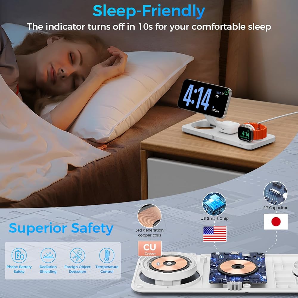 حماية متعددة الأمان وصديقة للنوم: يوفر حامل الشحن اللاسلكي هذا حماية من الجهد الزائد والتيار الزائد والدائرة القصيرة، بالإضافة إلى التحكم في درجة الحرارة للحفاظ على برودة جهازك. يضمن اكتشاف الأجسام الغريبة الشحن الآمن. تنطفئ مؤشرات LED بعد 10 ثوانٍ، مما يؤكد الشحن دون إزعاج نومك.