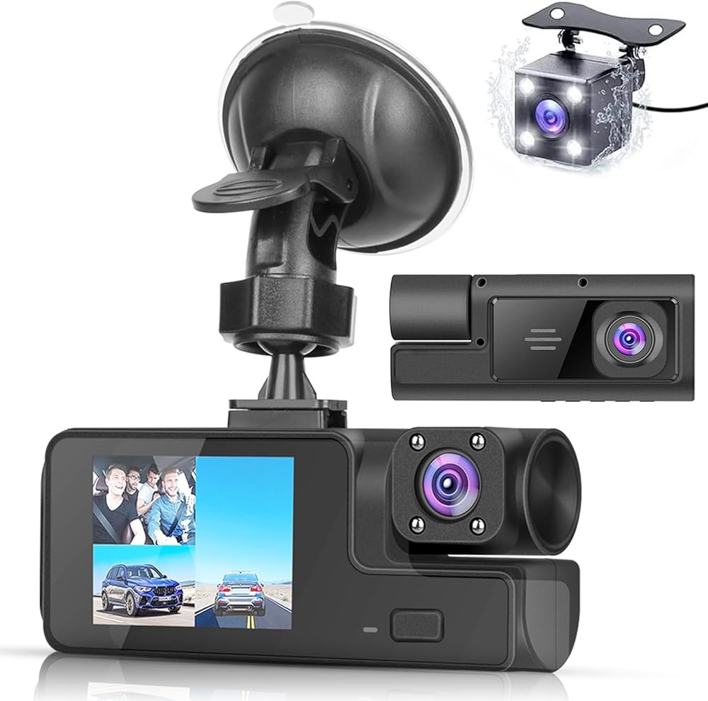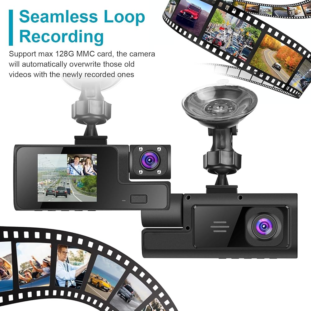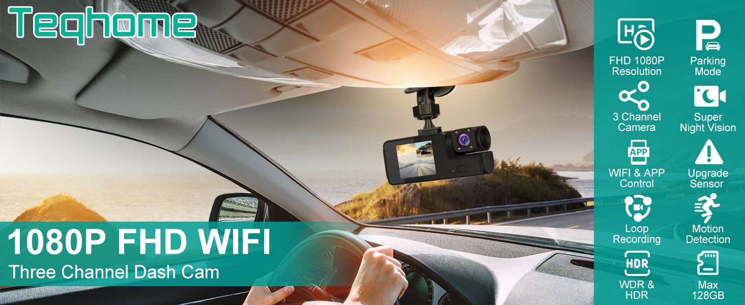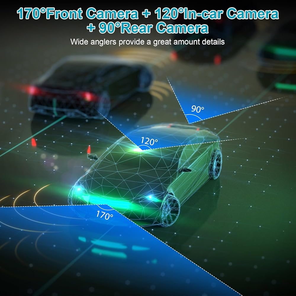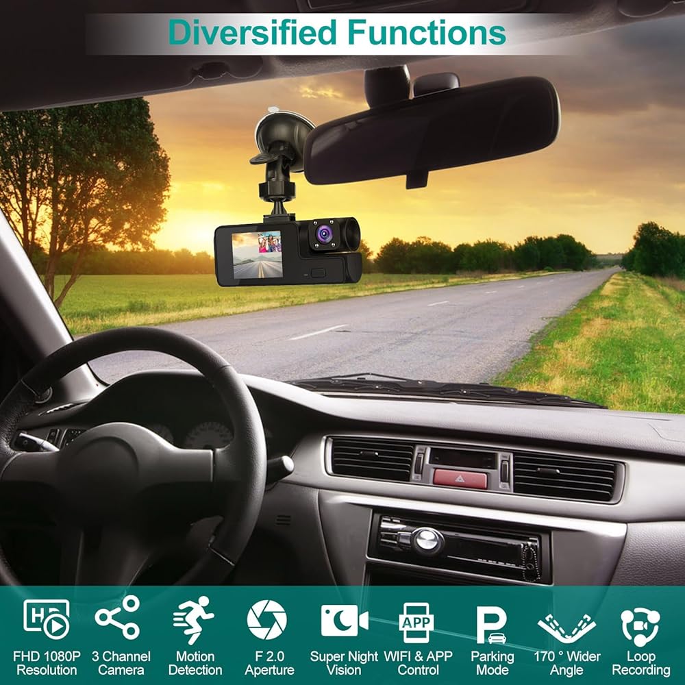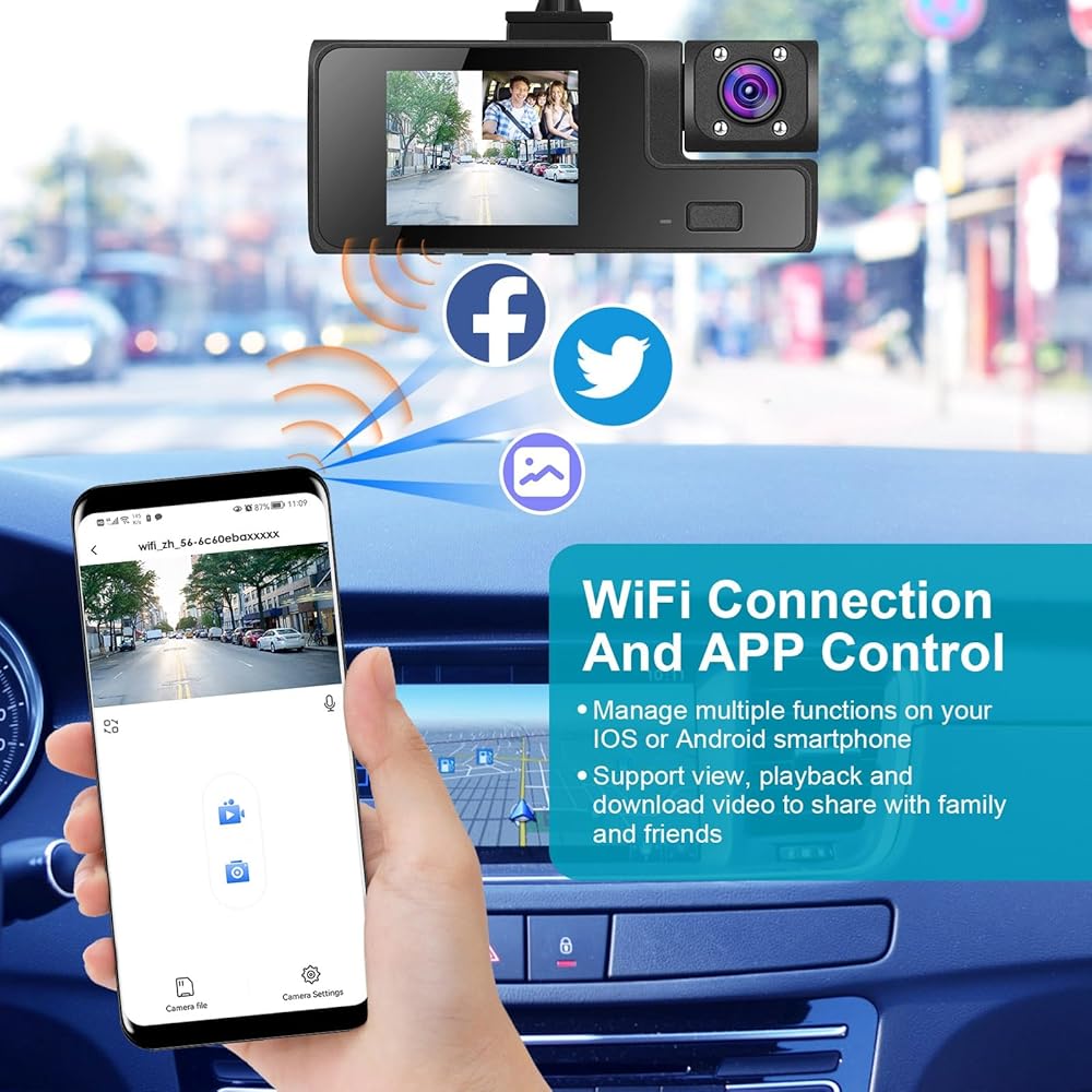 كاميرا داش كام أمامية وخلفية، 1080 بيكسل فل اتش دي واي فاي لداشات السيارات مع التطبيق، كاميرا داش ثلاثية الاتجاهات مع رؤية ليلية، WDR، زاوية واسعة 170 درجة، تسجيل حلقي، كشف الحركة، دعم 128 جيجابايت كحد أقصى