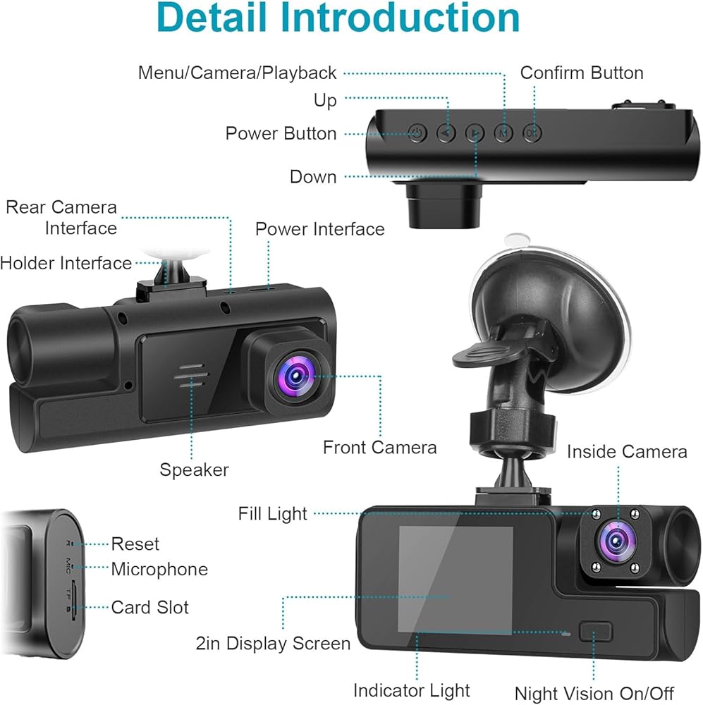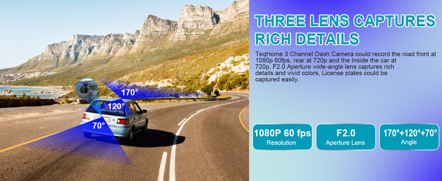 [كاميرا قياس ثلاثية القنوات للحماية الشاملة] - كاميرا أجهزة قياس Teqhome مصممة بنظام ثلاثي القنوات، وتوفر كاميرا أمامية 170 درجة، وكابينة 120 درجة داخل الكاميرا، وكاميرا خلفية 90 درجة. يلتقط الفيديو في نفس الوقت من الجزء الأمامي والخلفي ومقصورة سيارتك كدليل حيوي للنزاع أو الحادث.