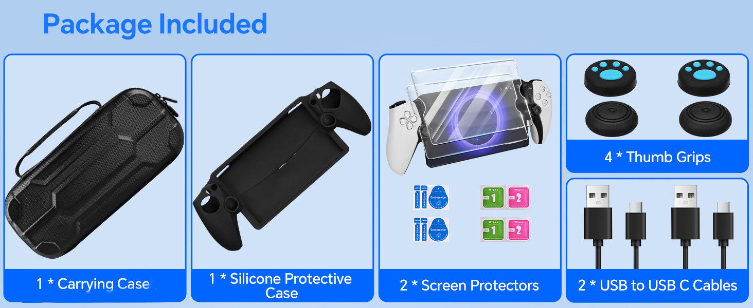 مجموعة الملحقات المتوافقة مع بوابة PS: تتضمن مجموعة الملحقات 10 في 1 الخاصة بنا 1 * حقيبة حمل متوافقة مع بوابة PS، 1 * حافظة واقية من السيليكون، 2 * واقيات الشاشة، 4 * مقابض الإبهام، 2 * كابلات USB إلى USB C
