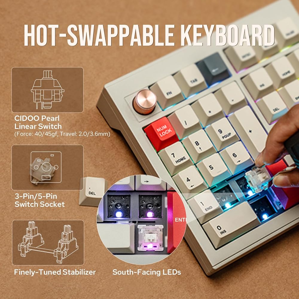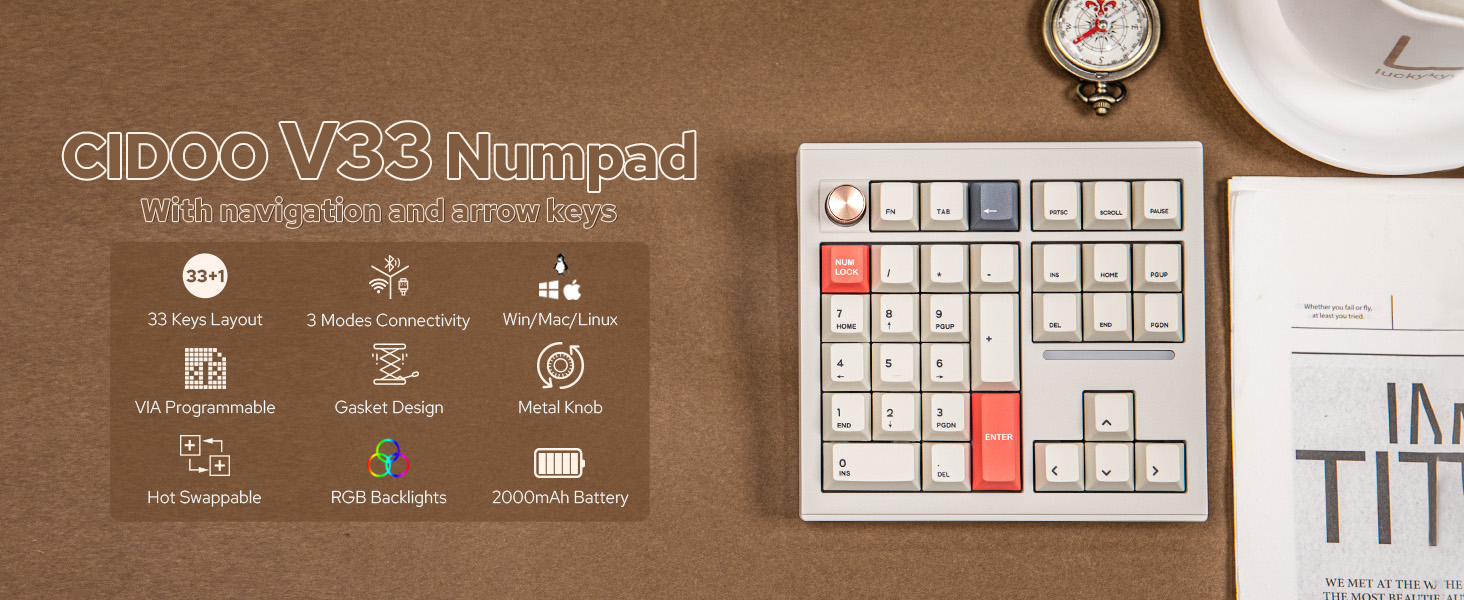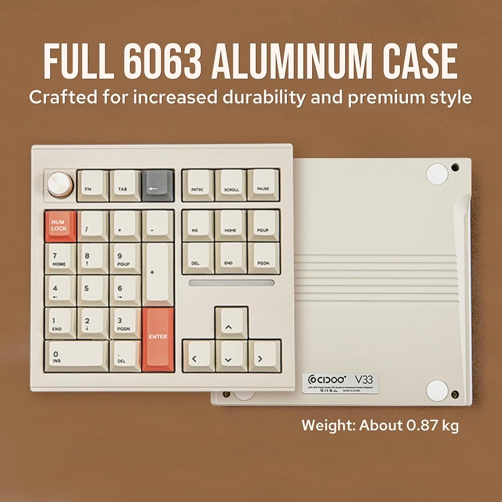 CIDOO V33 لوحة أرقام لاسلكية من الألومنيوم، لوحة أرقام VIA Gasket، لوحة مفاتيح مع ملاحة، مفاتيح أسهم، مقبض، اتصالات سلكية BT5.0/2.4 جيجا هرتز/USB-C لنظام التشغيل Windows/Mac OS/Linux
